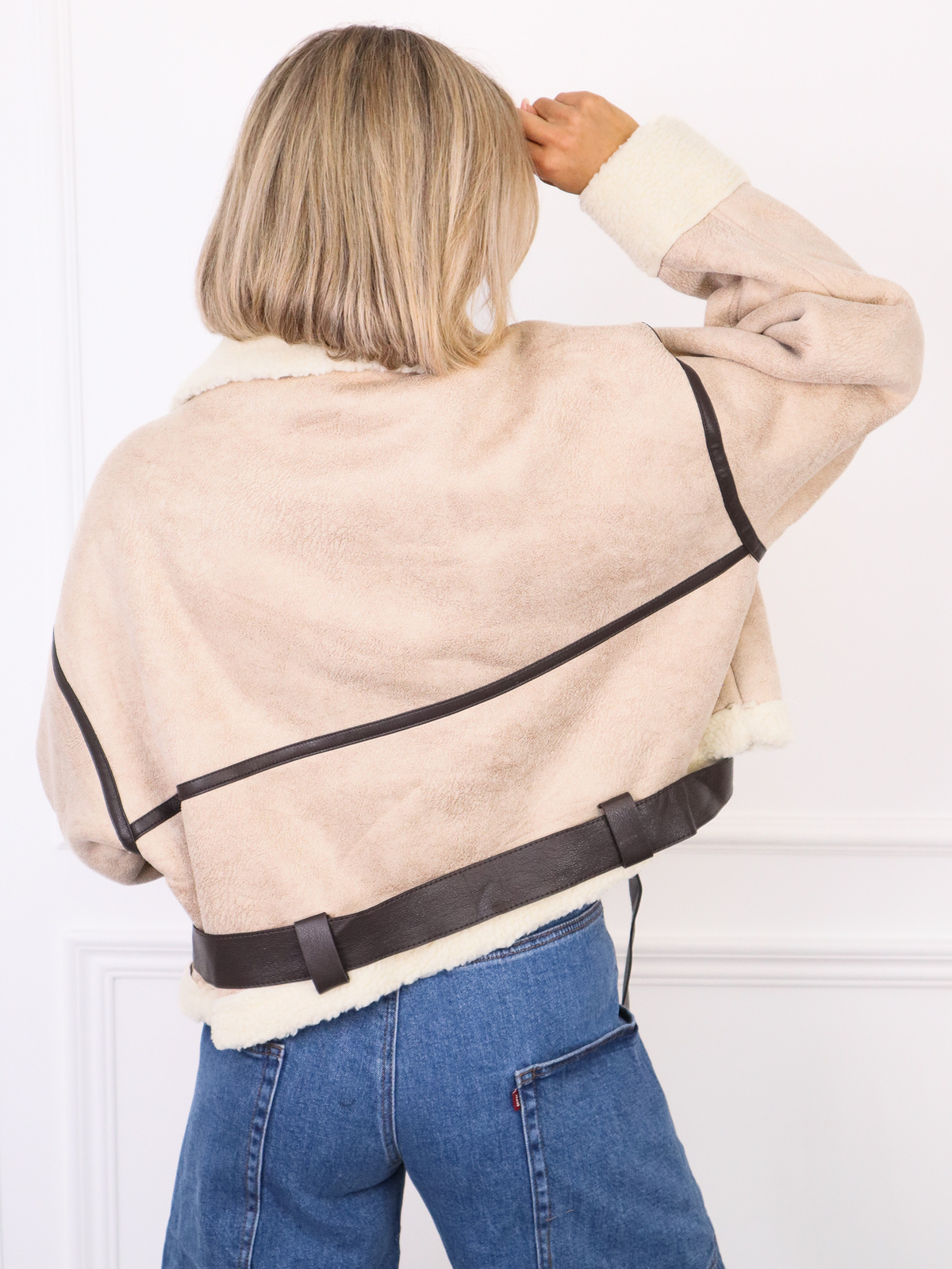 KURTKA ZIMOWA KOŻUSZEK Z PASKIEM NA DOLE- BEŻOWY