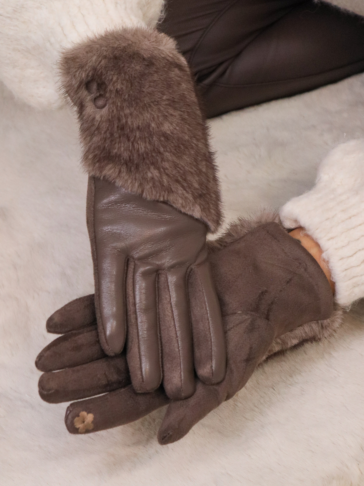 RĘKAWICZKI OCIEPLANE Z EKOSKÓRY I ZAMSZU Z FUTERKIEM- CIEMNY BRĄZ