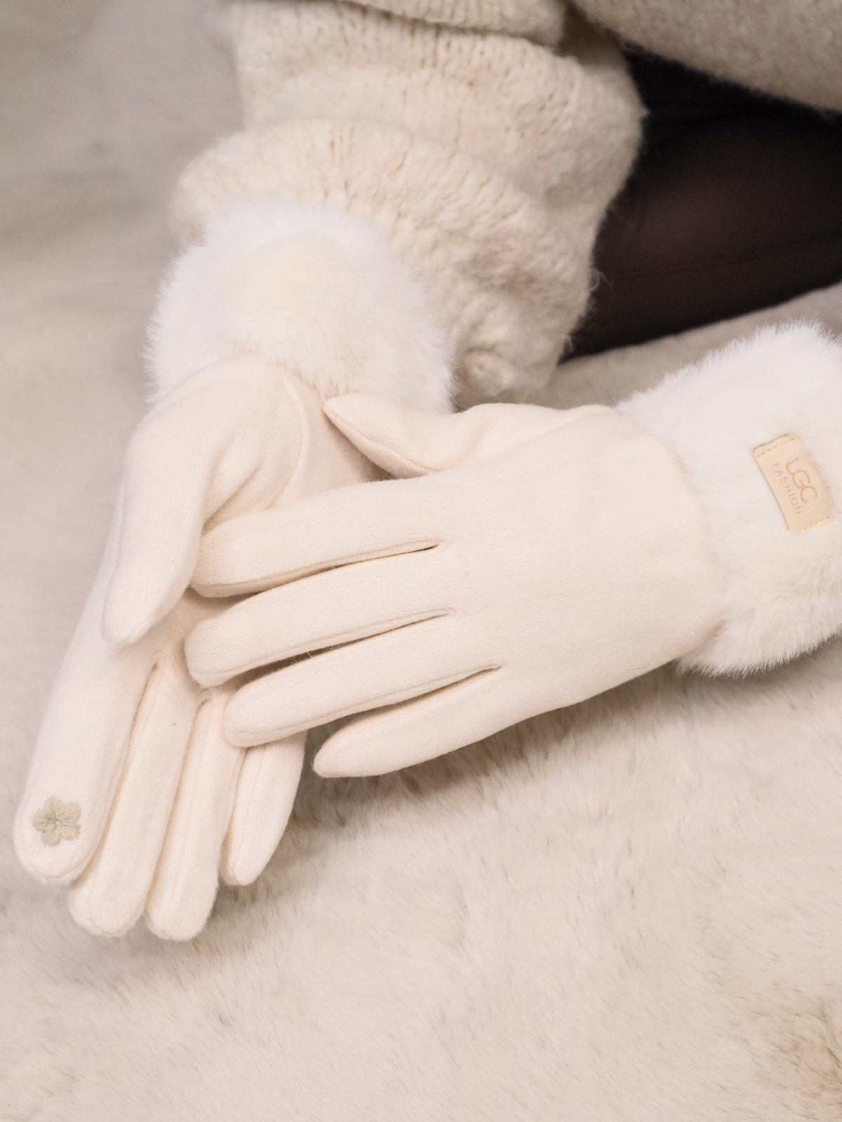 Rękawiczki wykonane z przyjemnej w dotyku dzianiny. Posiadają ozdobne futerko oraz naszywkę. Nie są w środku ocieplone Końcówka palca wskazującego umożliwiającym obsługę ekranów dotykowych