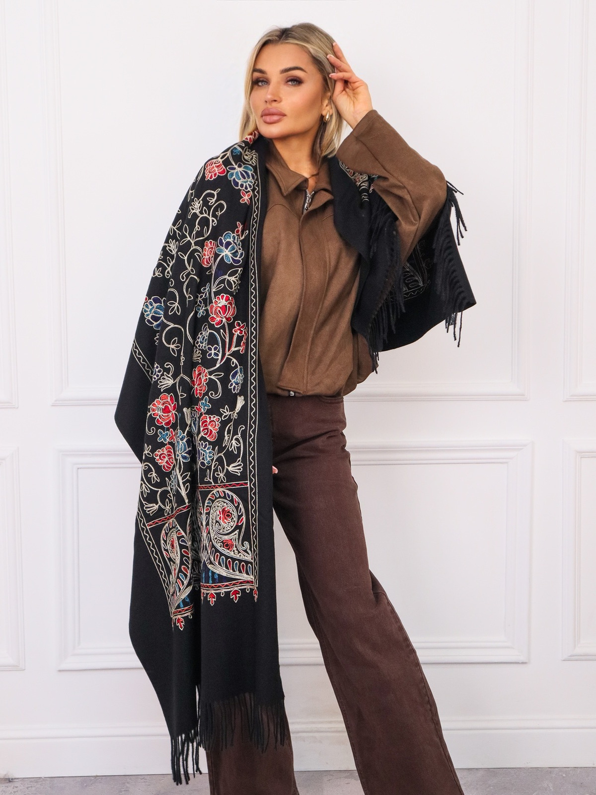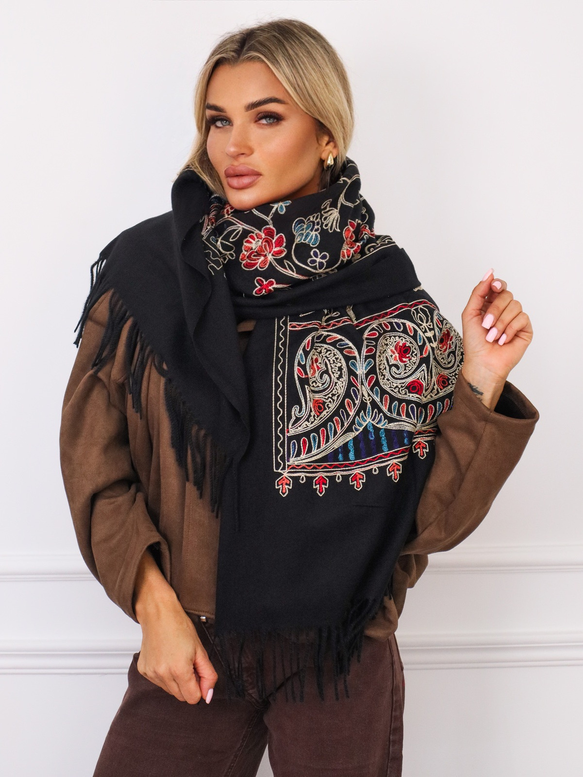 SZAL DZIANINOWY Z HAFTEM KWIATOWYM I FRĘDZLAMI- CZARNY