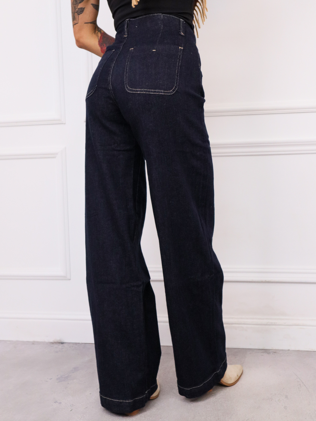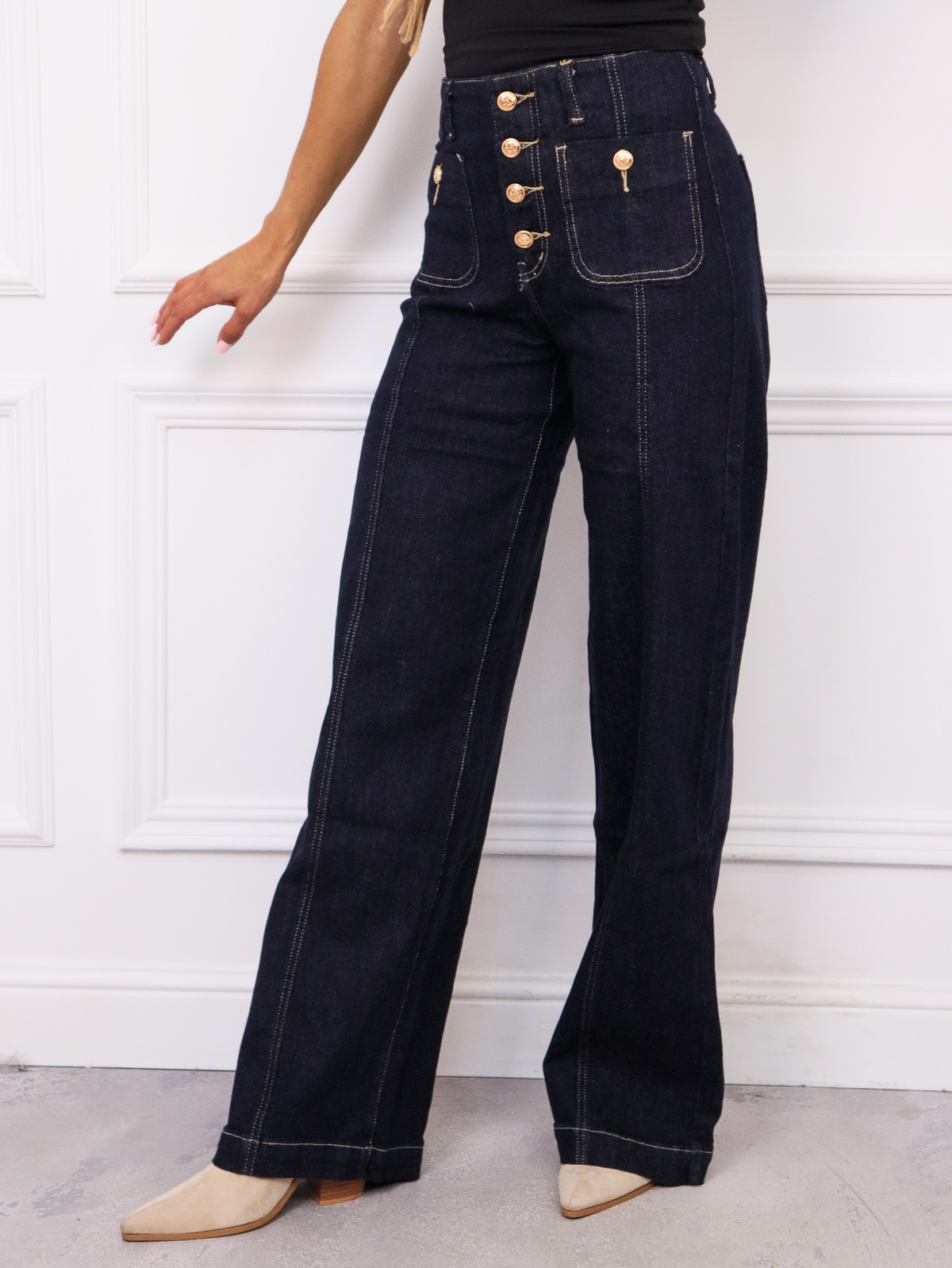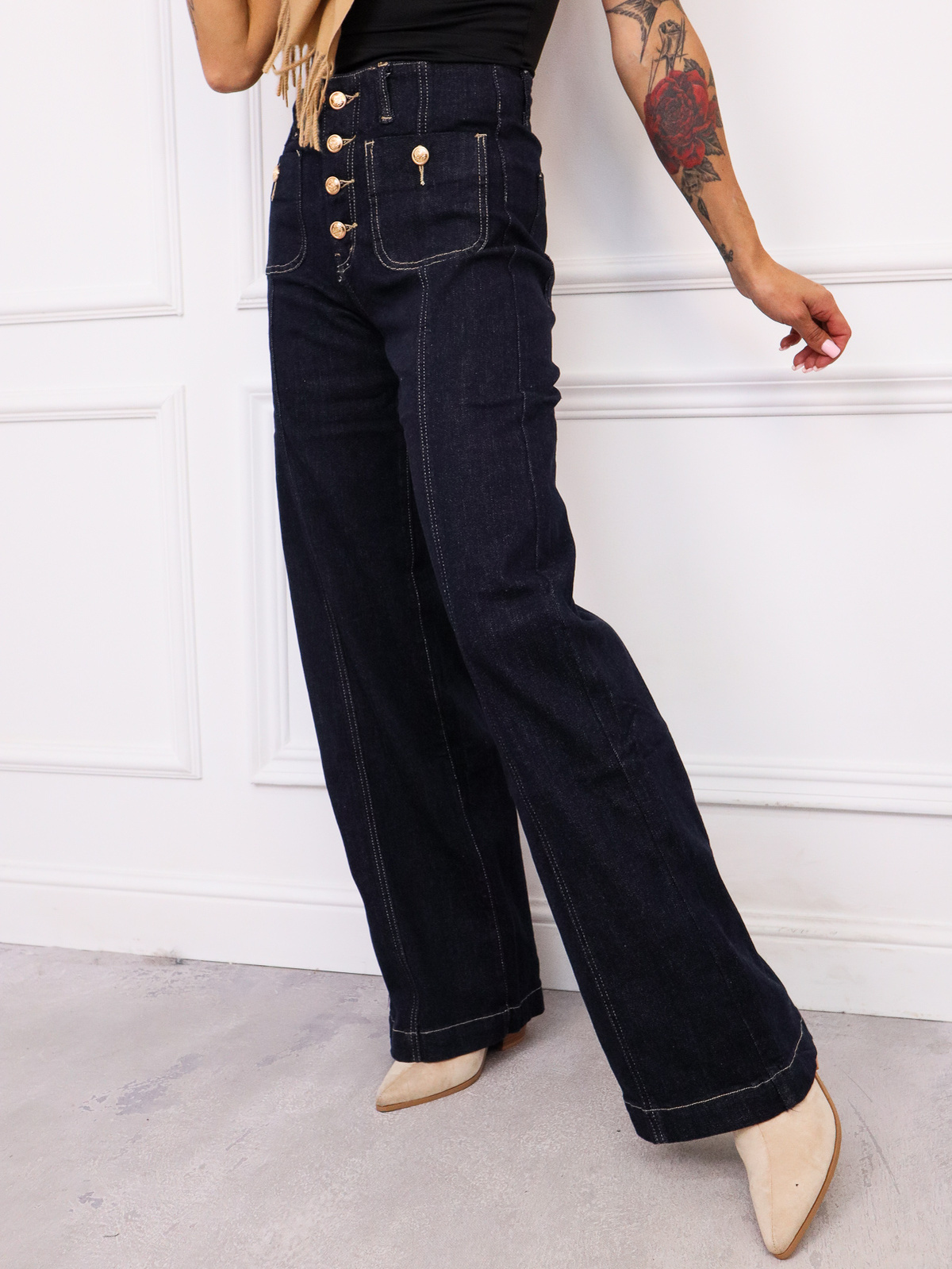 Spodnie jeansowe z szerokimi nogawkami i przeszyciami. Z przodu naszyte kieszenie. Zapinane na złote guziki.
