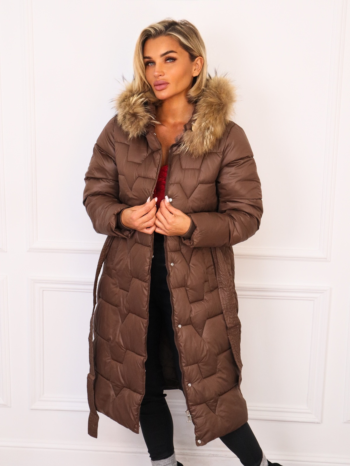 DŁUGA PIKOWANA KURTKA Z FUTERKIEM I PASKIEM- CZEKOLADOWA