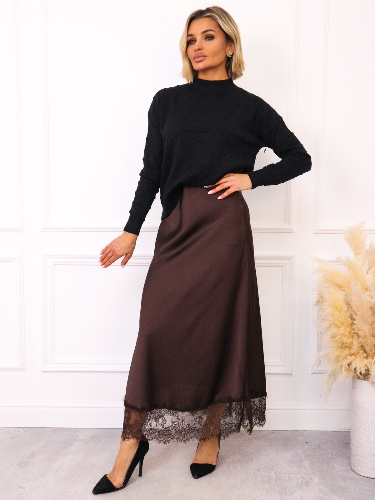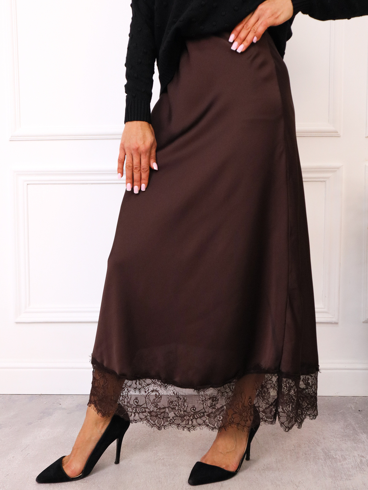 SPÓDNICA SATYNOWA MAXI ZAKOŃCZONA KORONKĄ- CZEKOLADOWA