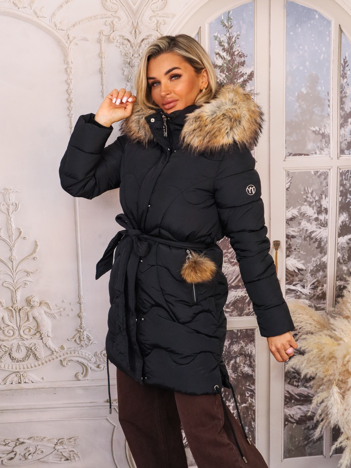 Długa pikowana kurtka, płaszcz z wiązaniem w pasie i futerkiem przy kapturze.