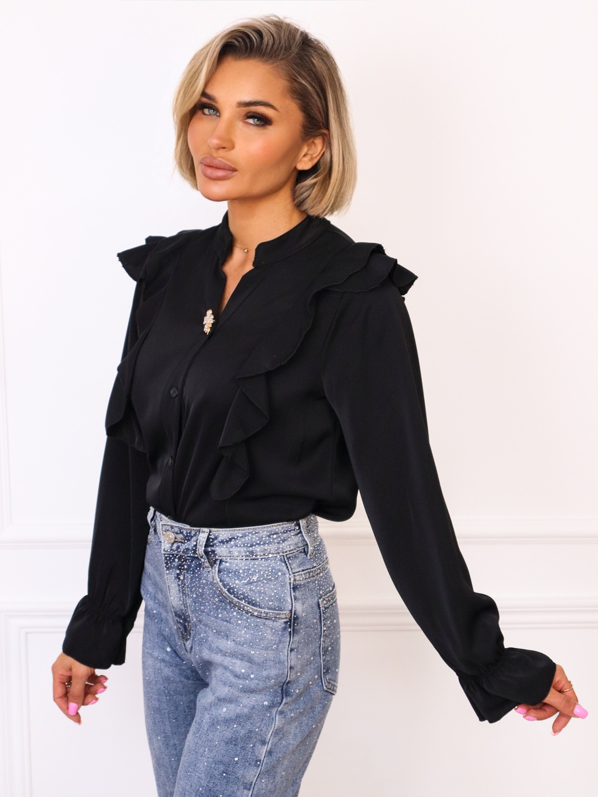 KOSZULA Z FALBANAMI I OZDOBNĄ BROSZKĄ- CZARNA