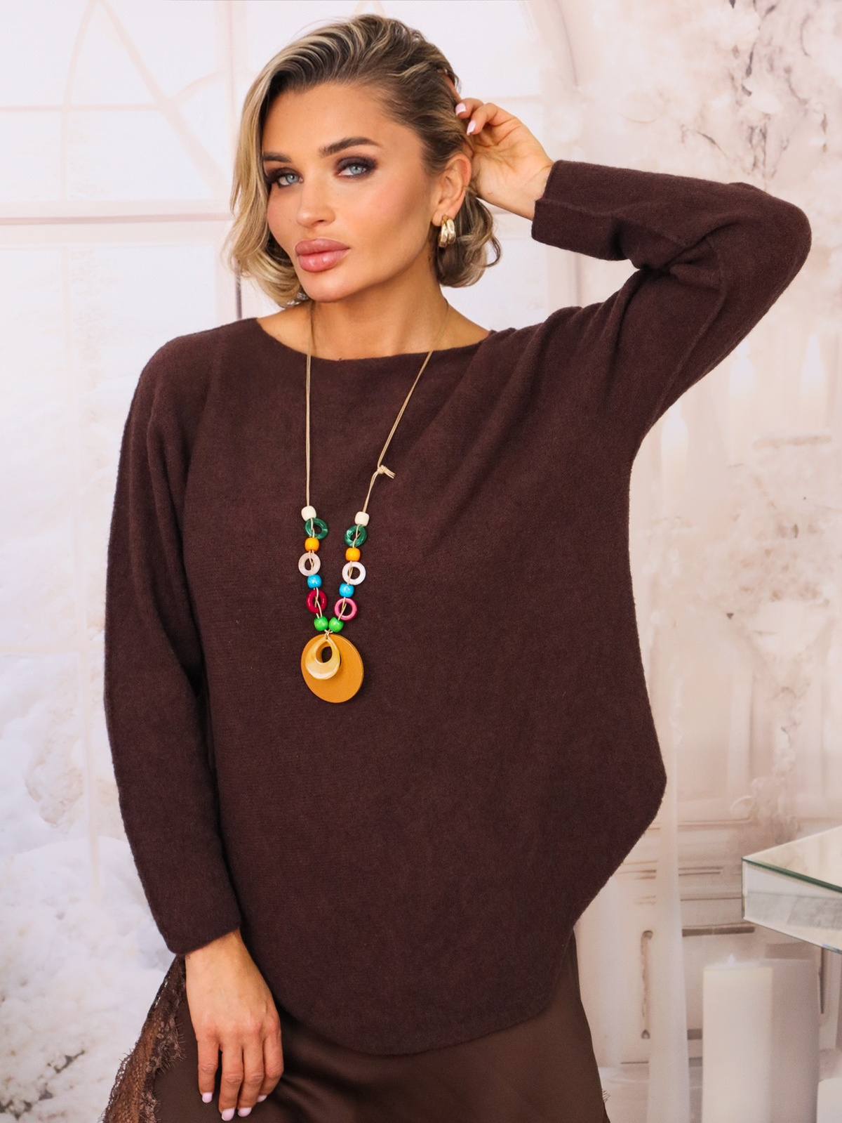 SWETER JEDNOLITY DZIANINOWY Z NASZYJNIKIEM- CZEKOLADOWY