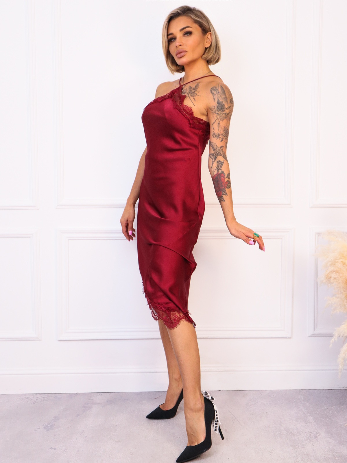 SUKIENKA SATYNOWA Z KORONKĄ I DEKOLTEM HALTER- BORDOWA