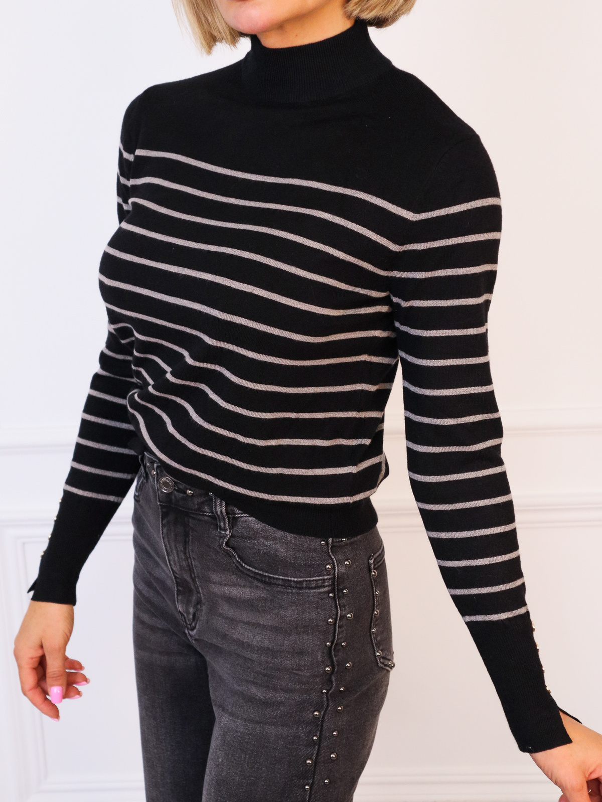 SWETER CZARNY W PASKI Z PÓŁGOLFEM