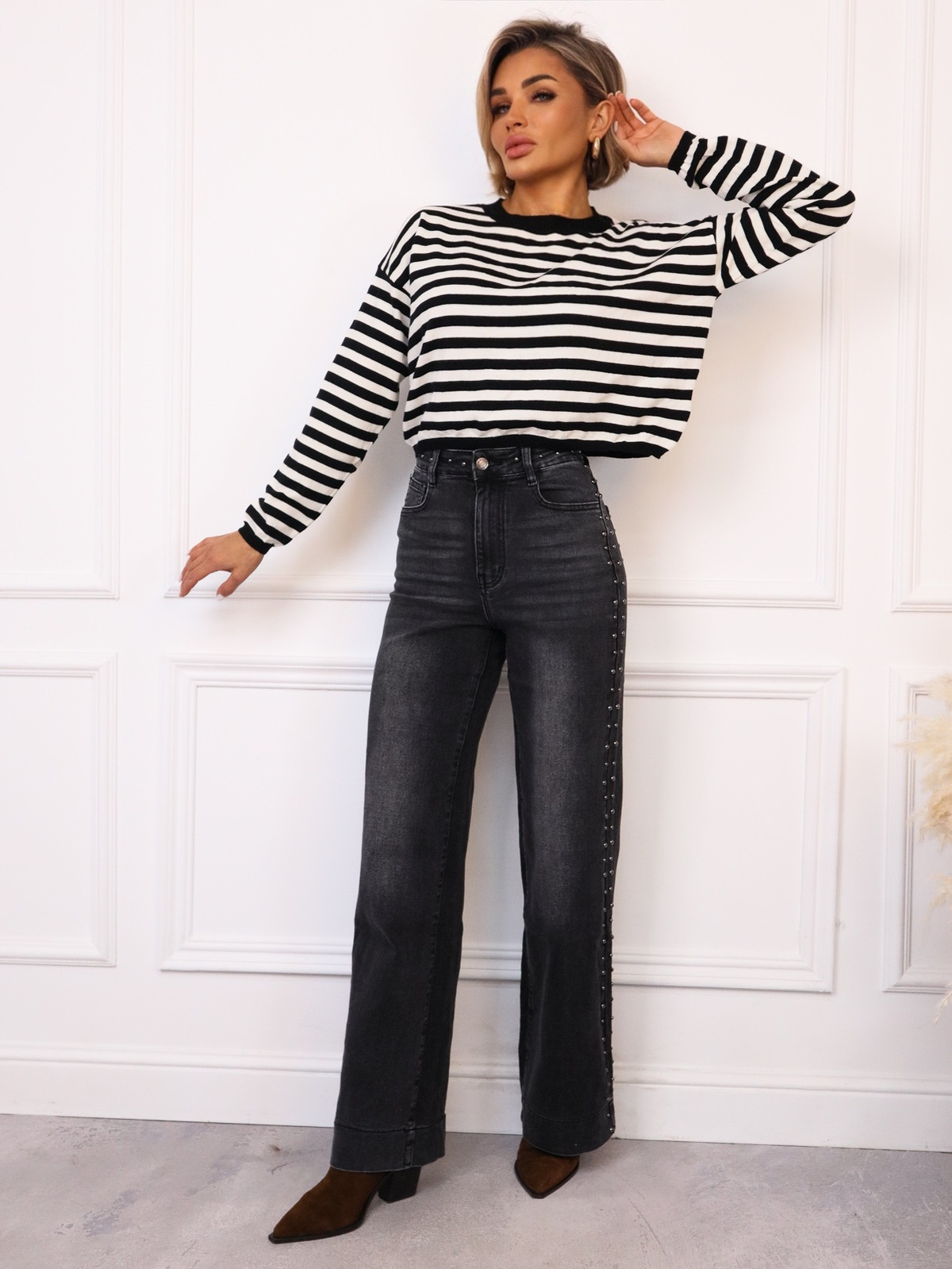 Spodnie jeansowe z szerokimi nogawkami i ozdobnymi dżetami po bokach.