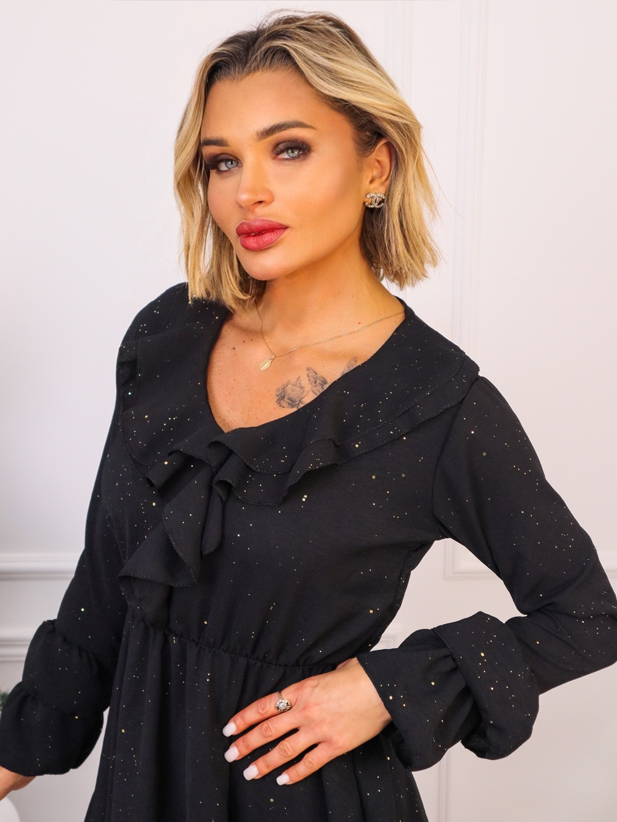 Sukienka z falbankami i brokatowymi drobinkami. Posiada ozdobny dekolt oraz rękawy.