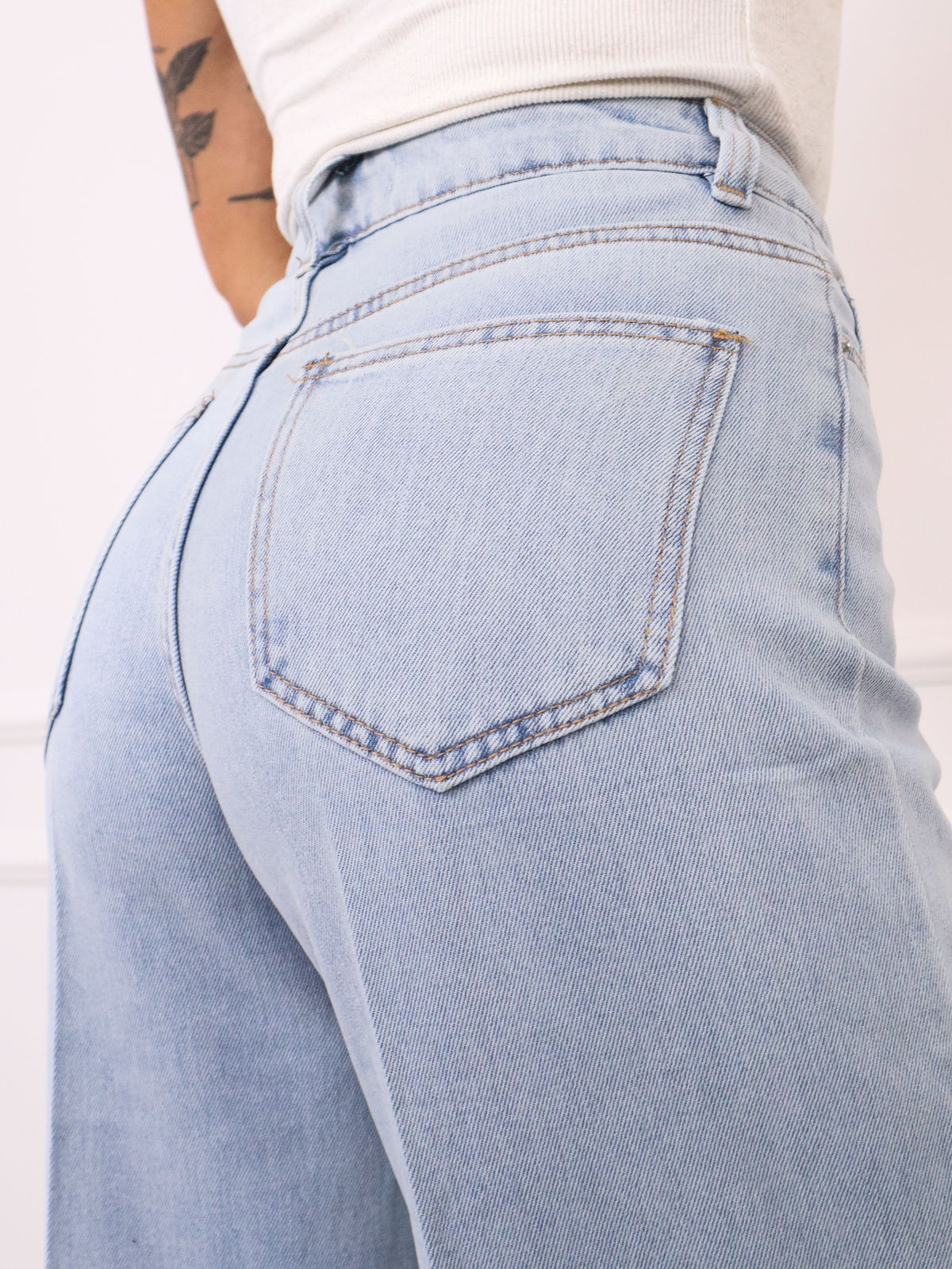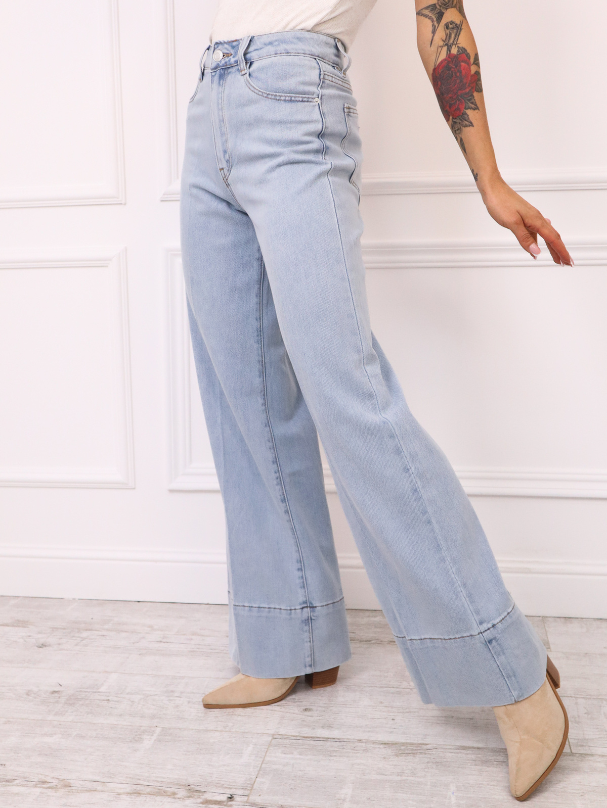 Spodnie jeansowe charakteryzują sięwysokim stanem i szerokimi nogawkami. Dół nogawek jest wykończony szerokim, podwiniętym mankietem.
