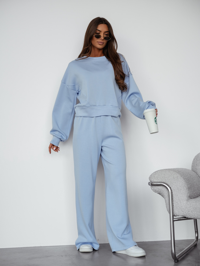 Komplet dresowy wykonany z materiału masełko, lekki i przyjemny w dotyku. Bluza klasyczna z okrągłym dekoltem. Spodnie w pasie z szeroką gumą i kieszeniach po bokach. oraz szerokie nogawki z przeszyciem z przodu i rozcięciem na nogawce.