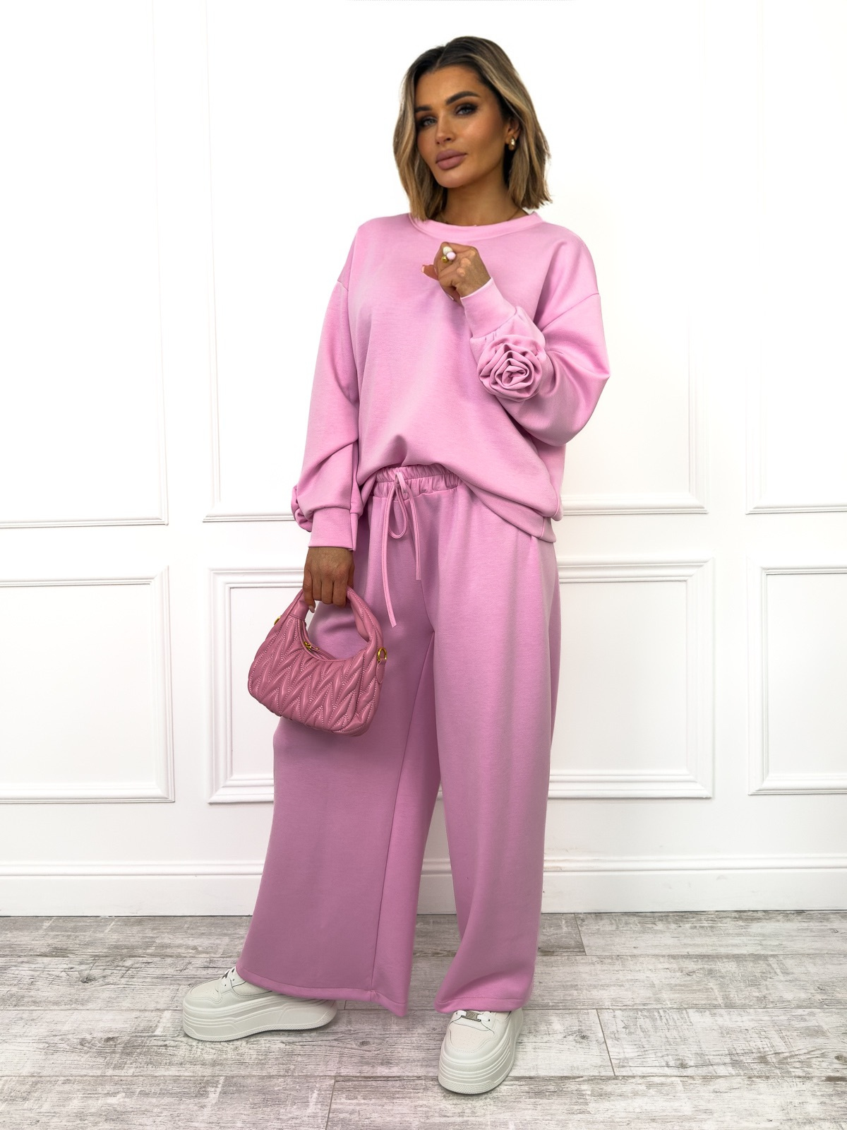 Komplet dresowy masełko. Bluza z ozdobnym kwiatami na rękawach+ spodnie z szerokimi nogawkami.