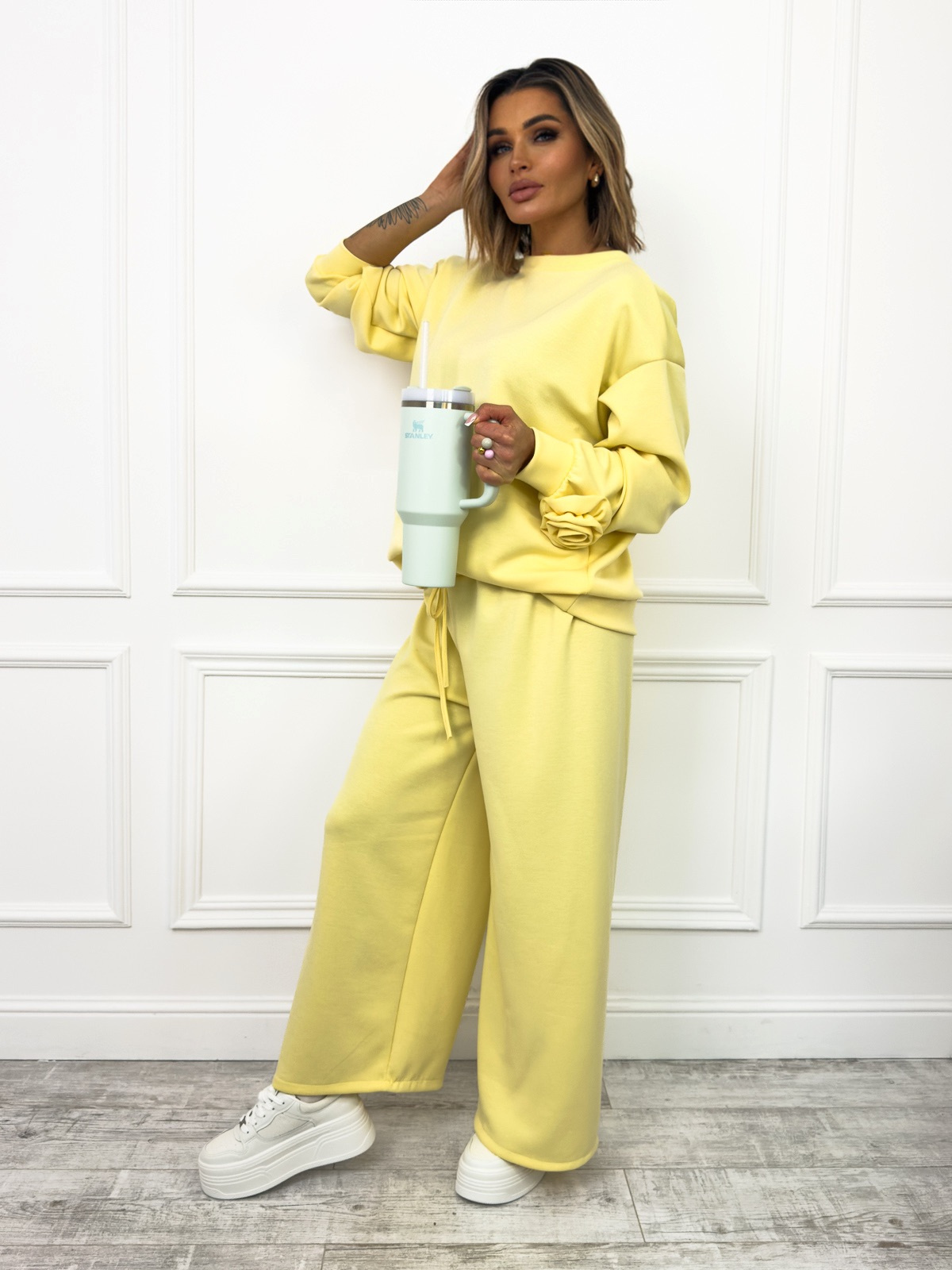 Komplet dresowy masełko. Bluza z ozdobnym kwiatami na rękawach+ spodnie z szerokimi nogawkami.