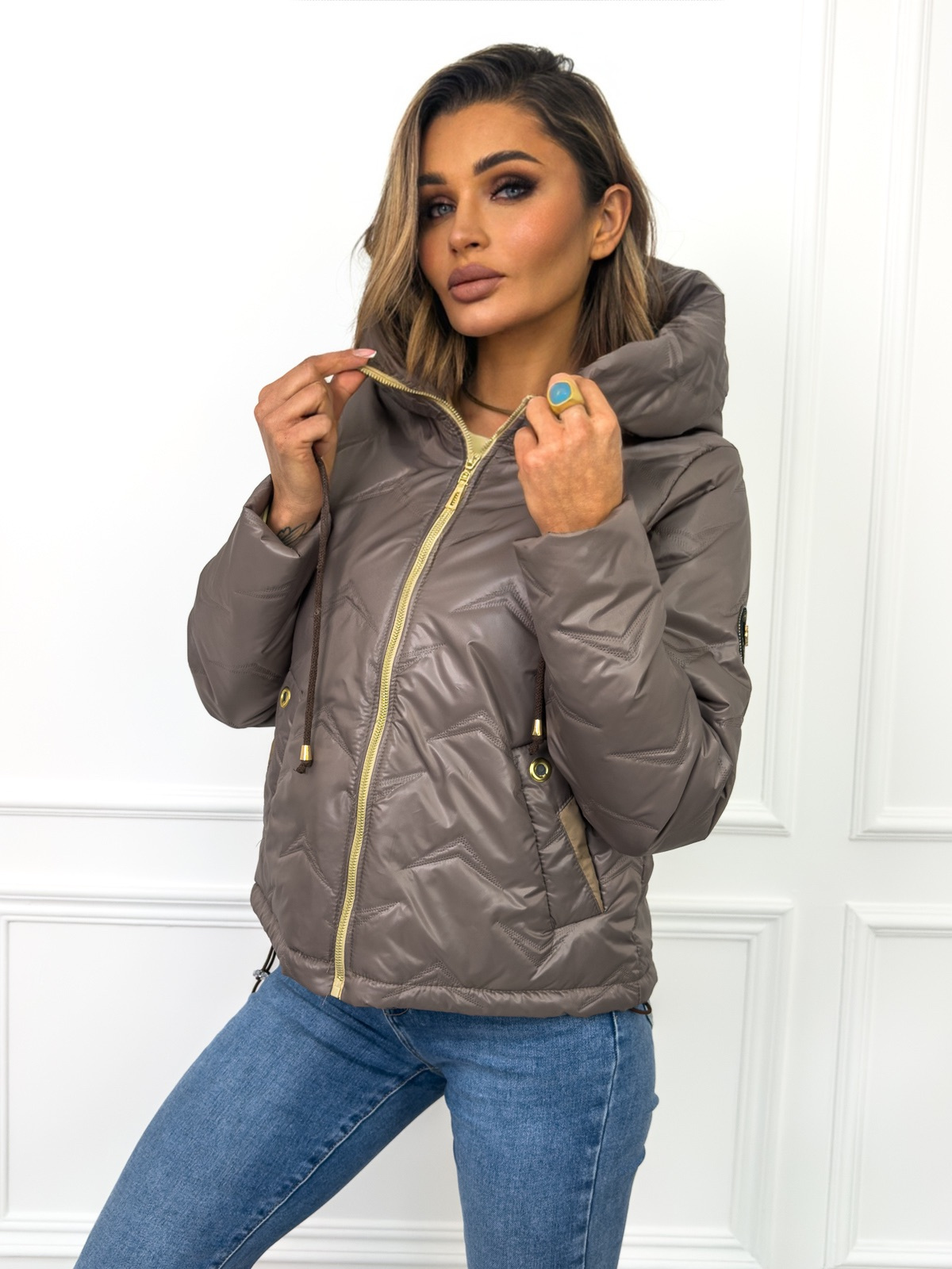 Kurtka przejściowa, pikowana z kapturem i ściągaczami po bokach.