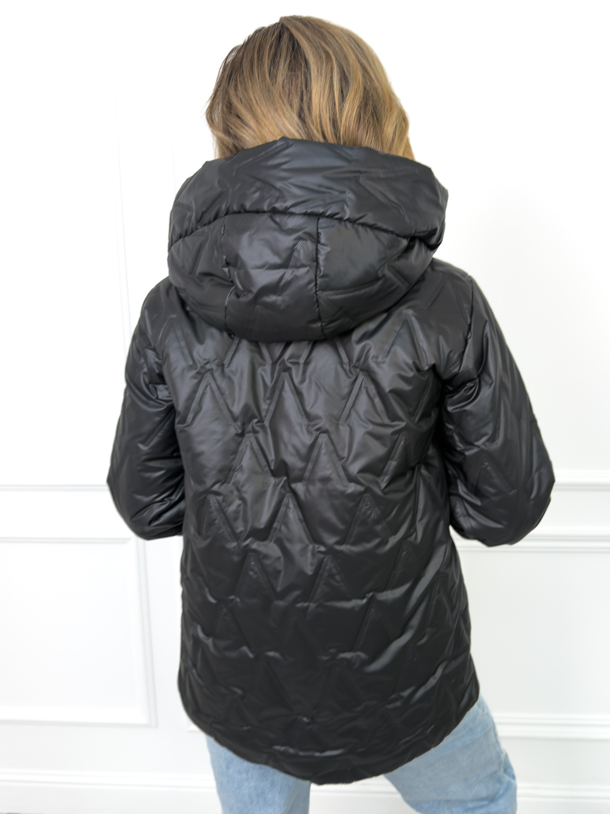 Kurtka przejściowa z kapturem i dłuższymi ściągaczami przy rękawach. Asymetryczny model z kontrastową podszewką.
