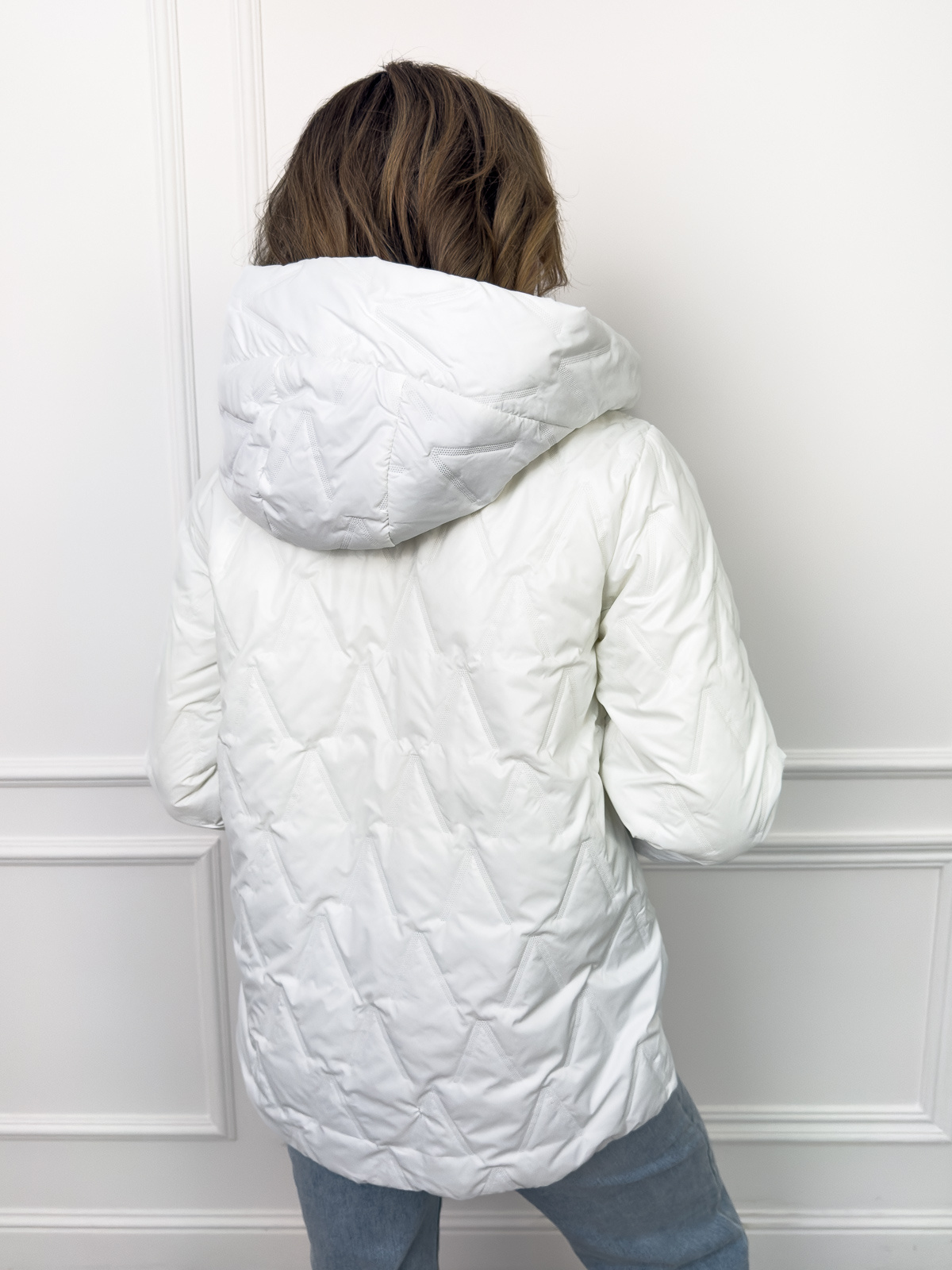 Kurtka przejściowa z kapturem i dłuższymi ściągaczami przy rękawach. Asymetryczny model z kontrastową podszewką.