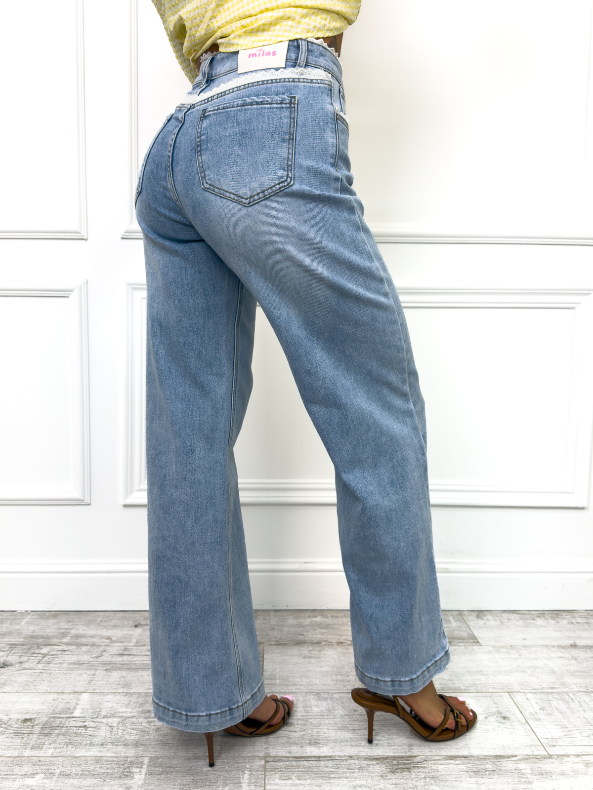 Spodnie jeansowe z szerokimi nogawkami. Zdobione koronką w pasie i przy kieszeniach.