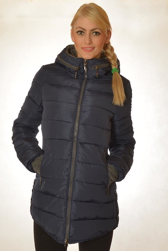 Granatowa,ortalionowa kurtka pikowana. Posiada kaptur z bawełnianą podszewką oraz z zamkami. Środek kurtki jest ocieplany futerkiem. Na końcach rękawów są ściągacze.