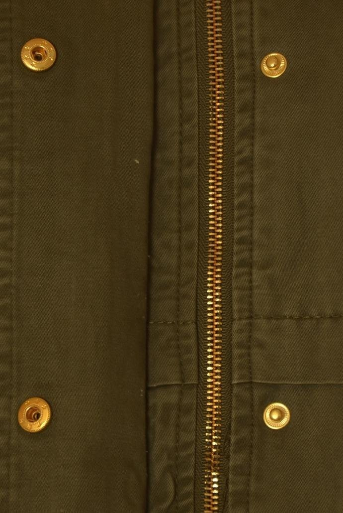 Zielony płaszcz zapinany na zamek. W środku obszyty futerkiem i wiązany w pasie. Kaptur obszyty sztucznym lisem.