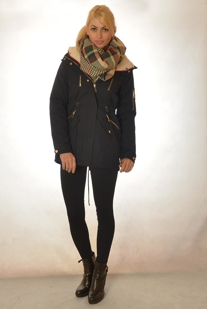 Czarna ocieplana kurtka zimowa. Zapinana na zamek oraz wiązana w pasie sznurkiem. Kaptur ocieplany wełną.