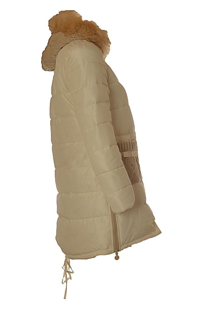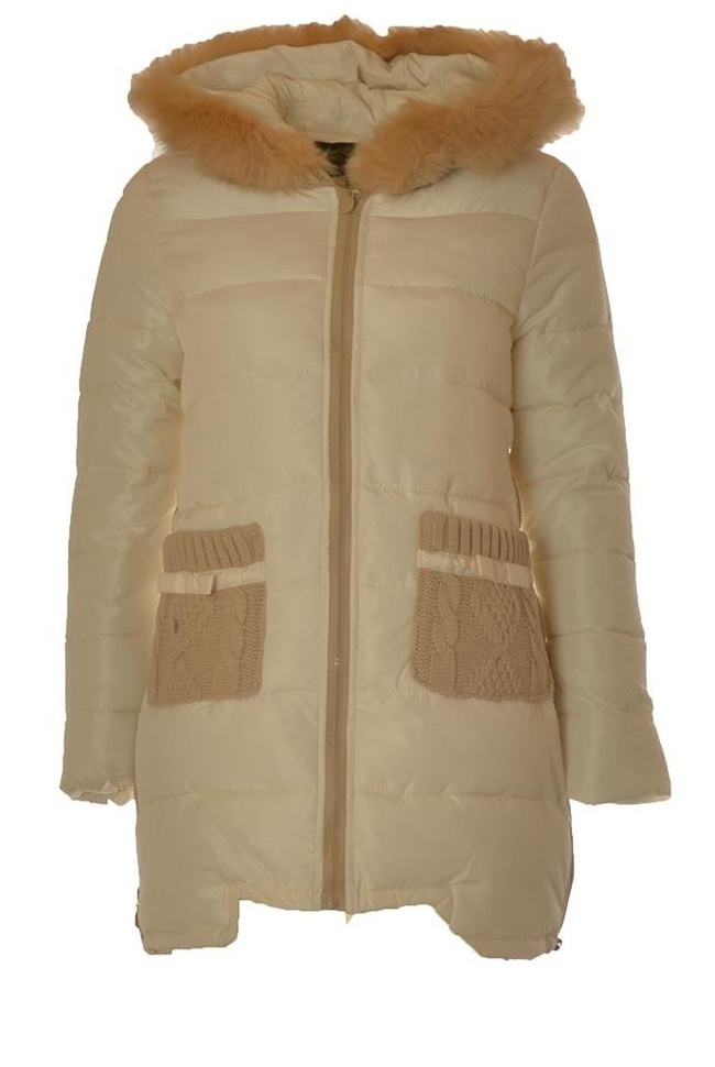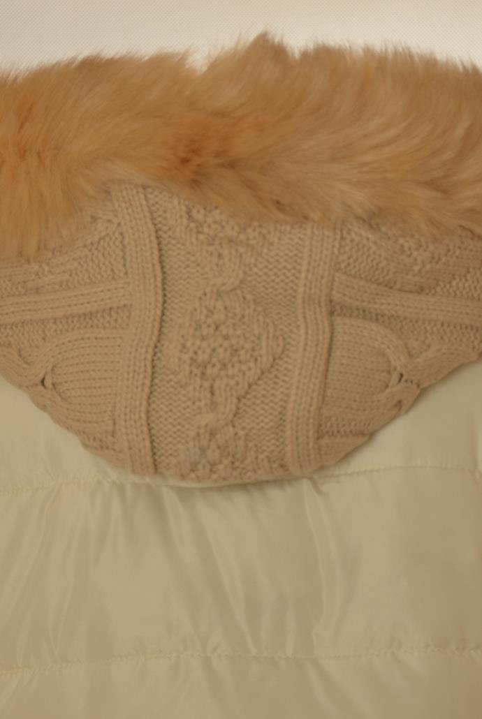 Kurtka zimowa w kolorze ekri z beżowymi zamkami, przy kapturze doszyte futerko. Kieszenie oraz kaptur ocieplone wstawką sweterkową. Na rękawach doszyte ocieplane ściągacze.