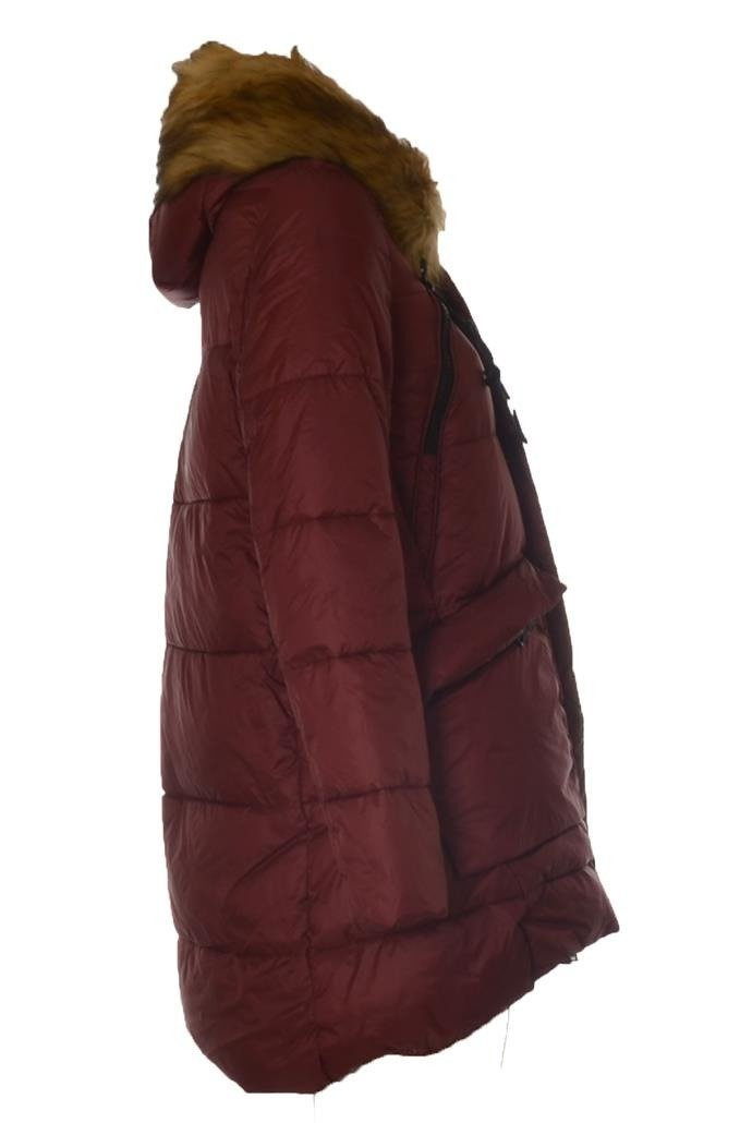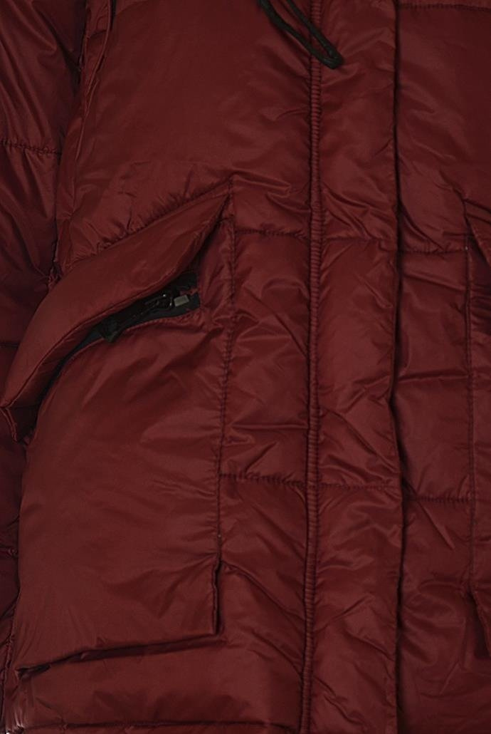 Bordowa kurtka zimowa zapinana na zamek i zatrzaski. Kaptur z doczepianym futerkiem. Rękawy wykończone ocieplanym ściągaczem.