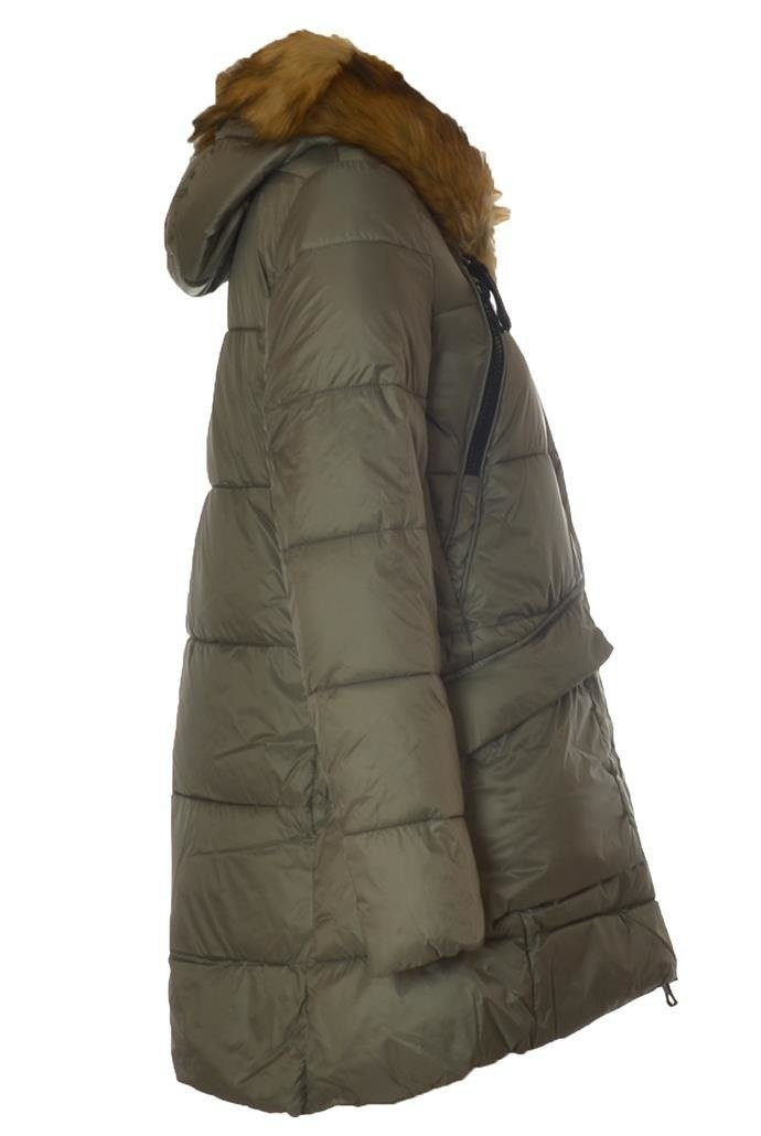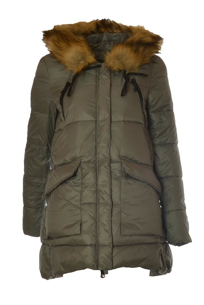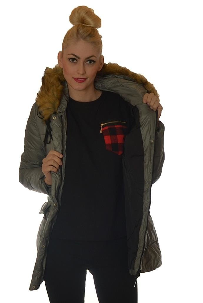Szara kurtka zimowa zapinana na zamek i zatrzaski. Kaptur z doczepianym futerkiem. Rękawy wykończone ocieplanym ściągaczem.