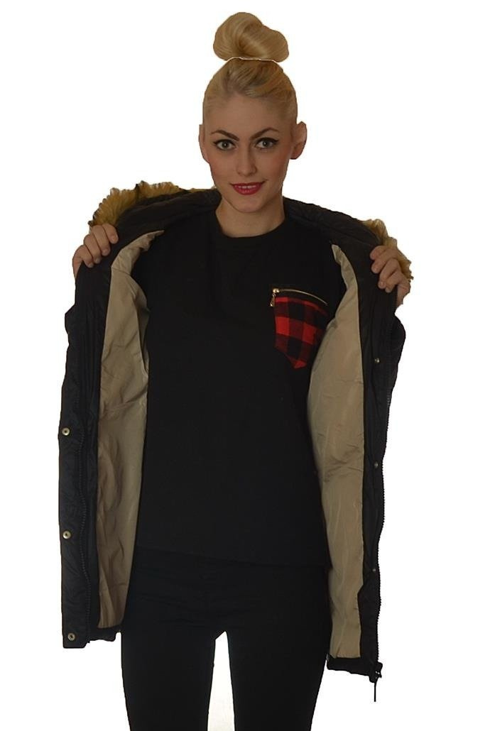 Czarna kurtka zimowa zapinana na zamek oraz zatrzaski. Kaptur z doczepianym futerkiem. Rękawy wykończone ocieplanym ściągaczem.