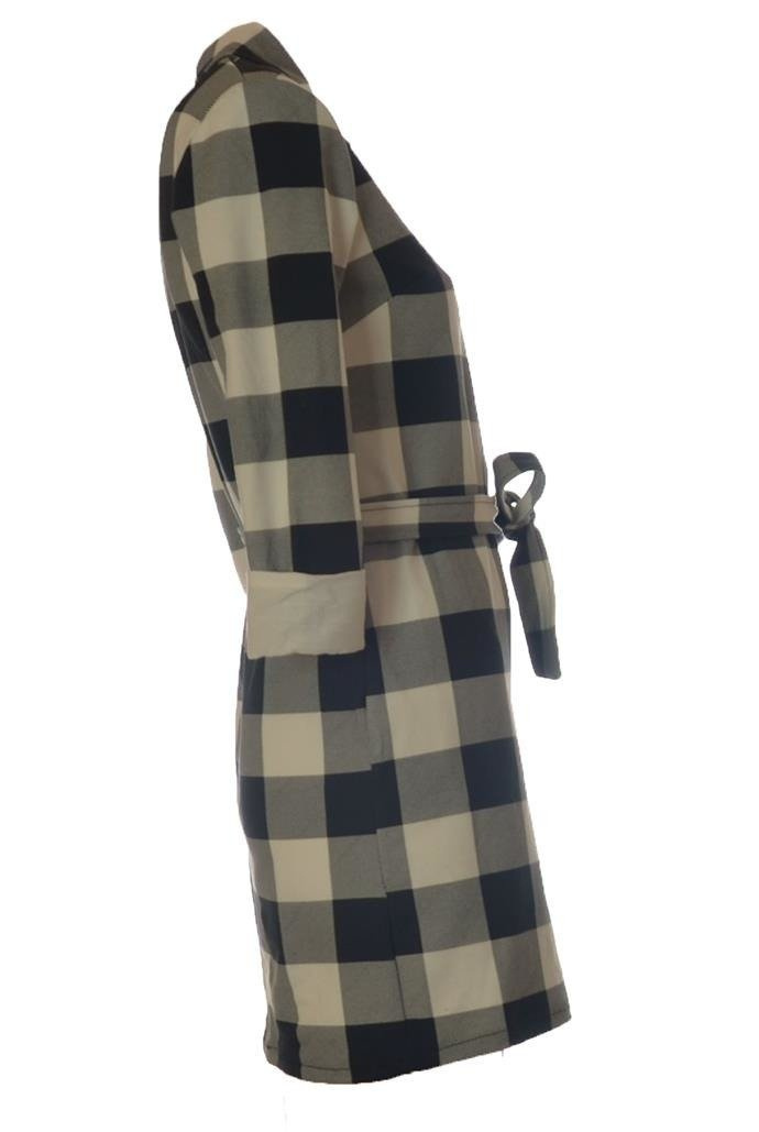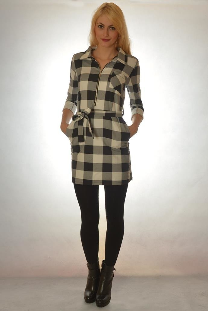 Biało-czarna sukienka w kratę, wiązana w pasie oraz zapinana na zamek. Z przodu naszyta kieszonka.