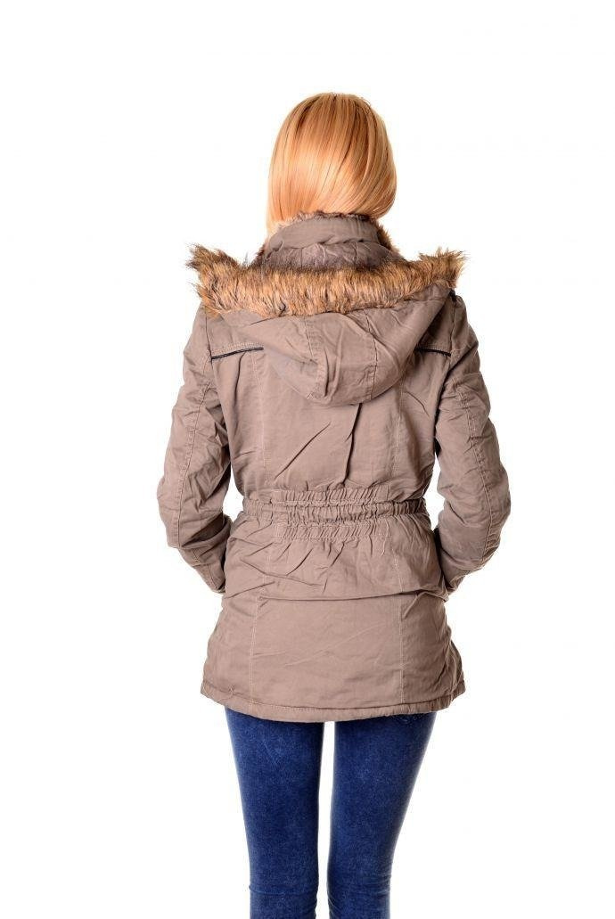 Bardzo ciepła, dłuższa kurtka z kapturem wykończonym futerkiem. Zapinana na zamek , oraz guziki, wiązana w talii, cztery kieszenie z przodu ze wstawkami skóry ekologicznej.