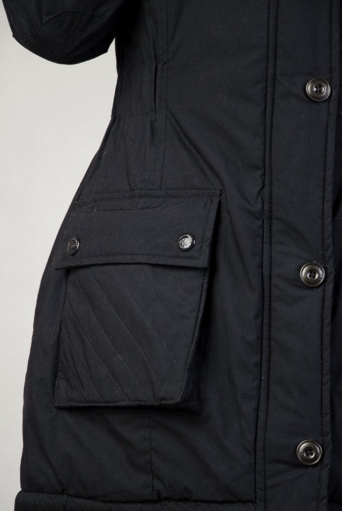 Dłuższa kurtka z kapturem wykończonym futerkiem. Zapinana na zamek, oraz guziki. Z tyłu ściągacz. Z przodu kurtka posiada zapinane pikowane kieszenie. Idealna na chłodniejsze dni.