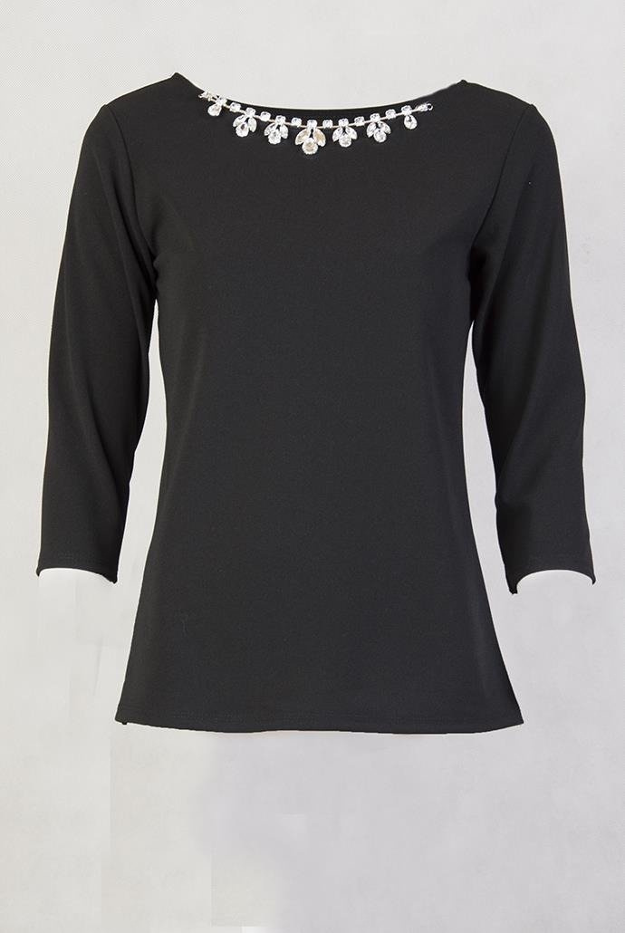 Czarna bluzka z cyrkoniami przy dekolcie.