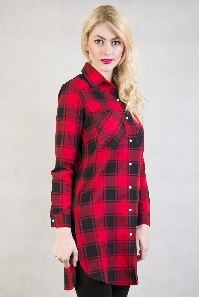 Koszula w czarną kratę z kieszeniami bo obu stronach dekoltu i napisem na placach.