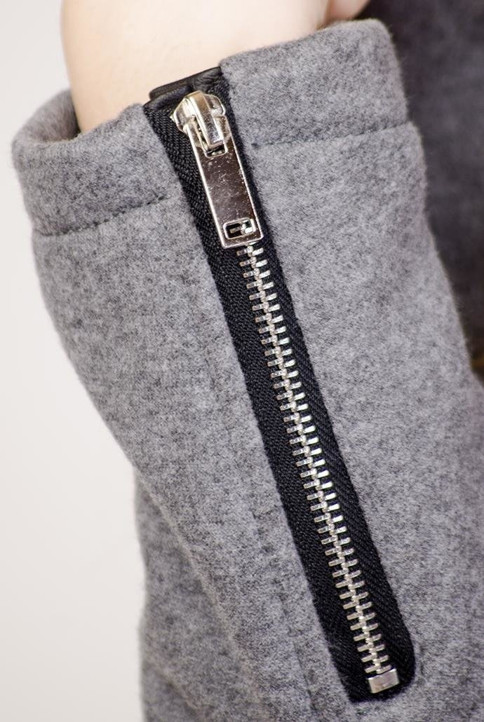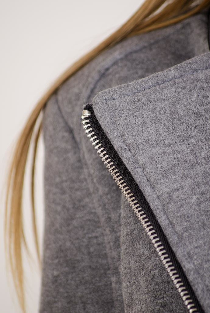 Ciemno-szary płaszcz ze skórkowymi wstawkami, zapinany na zamek.