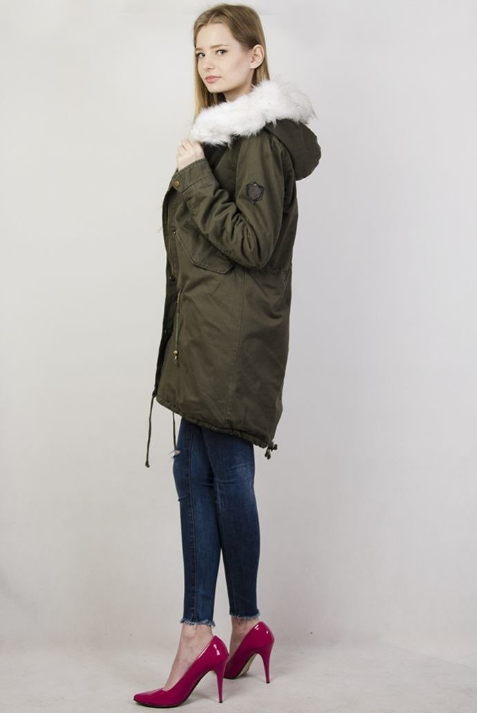 Kurtka khaki typu parka z białym futerkiem