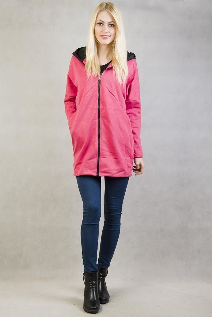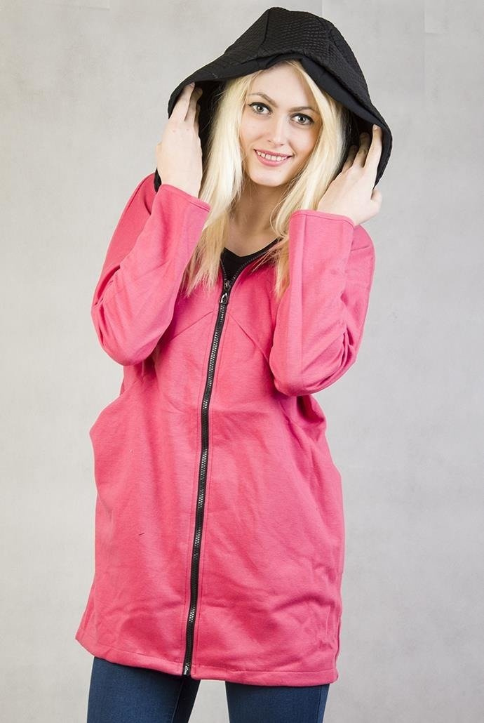 Różowa, długa bluza z pikowanym kapturem, zapinana na zamek