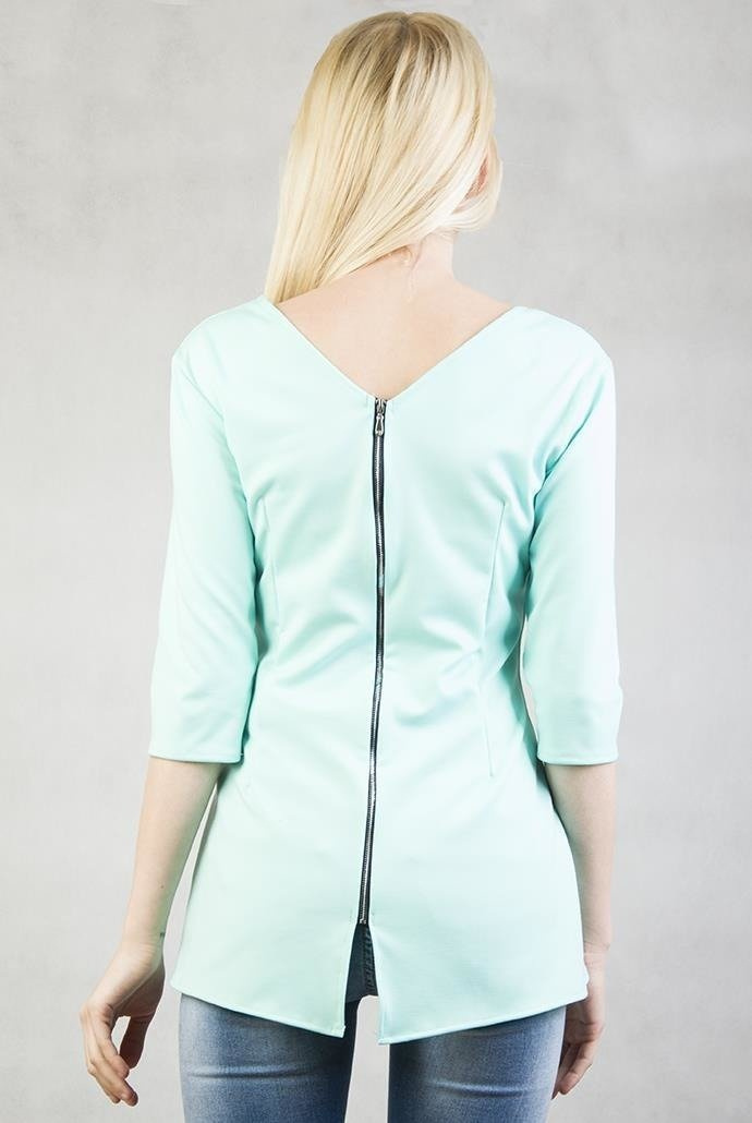 Turkusowa, asymetryczna bluzka zapinana na zamek z tyłu.