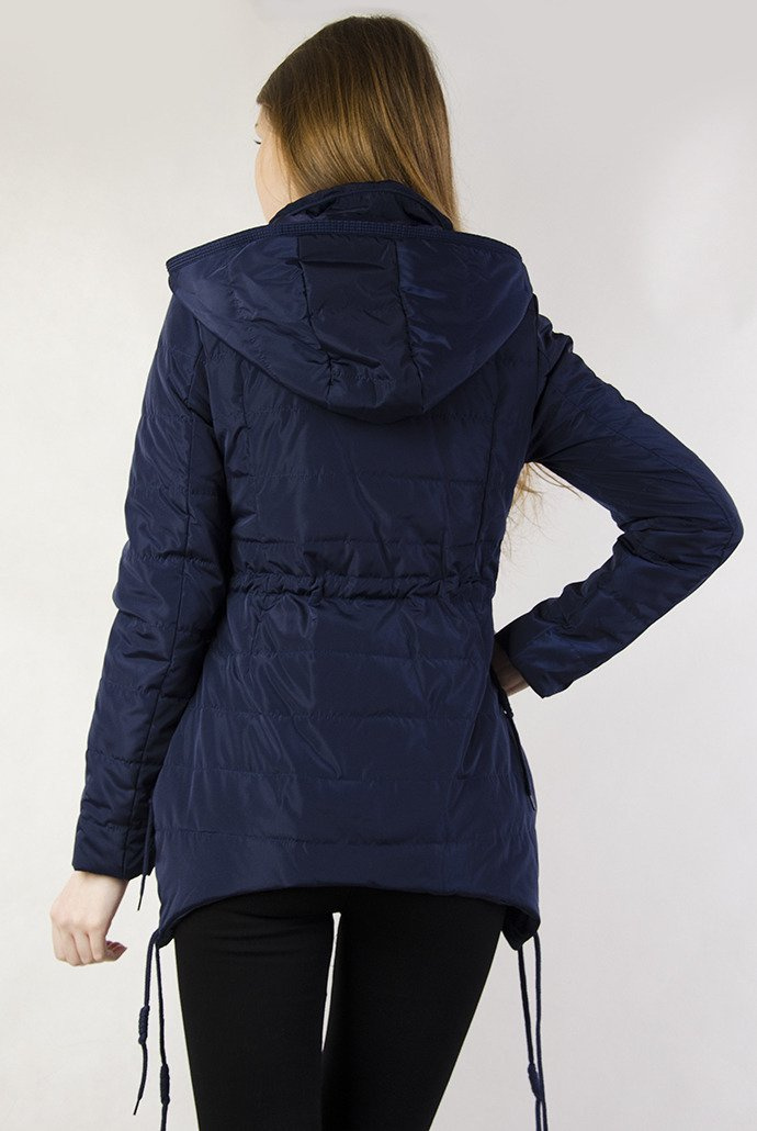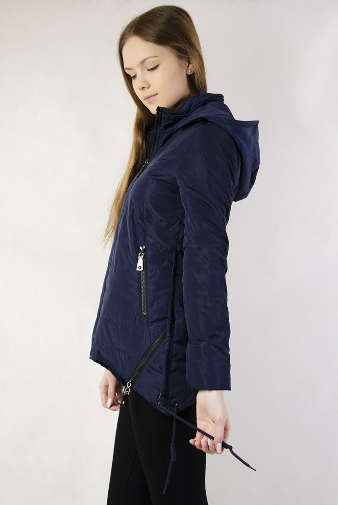 Wiosenna, asymetryczna granatowa kurtka z kapturem zapinana na zamek.