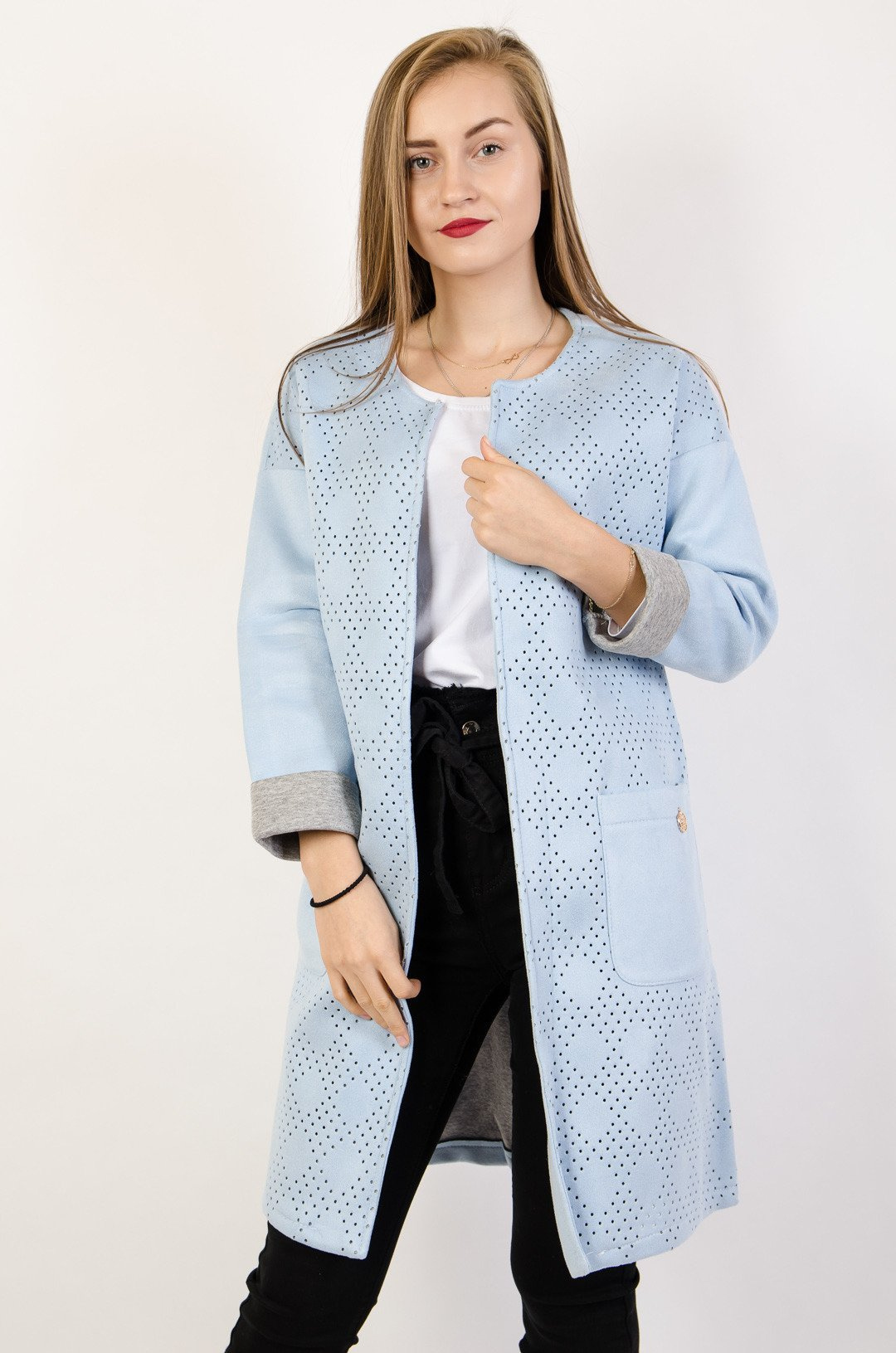Niebieska narzutka zamszowa z ażurowym przodem oraz kieszonką.