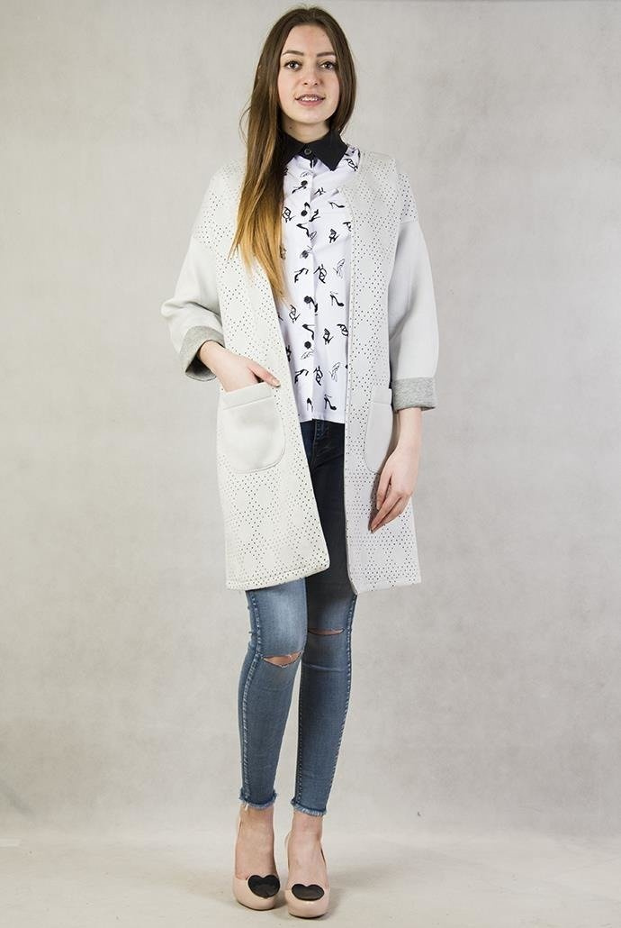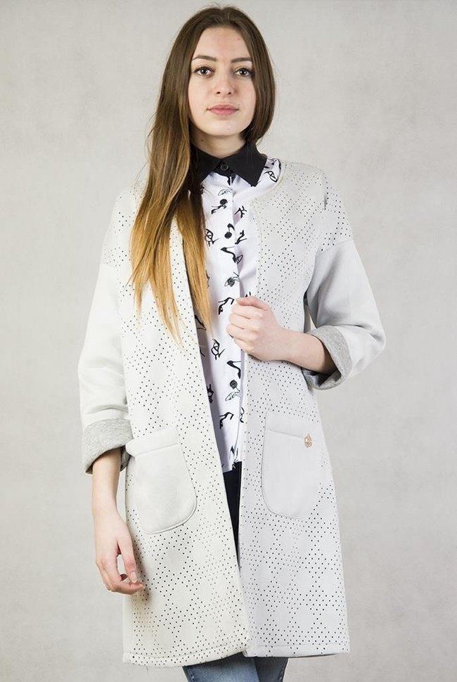 Szara narzutka zamszowa z ażurowym przodem oraz kieszonką.