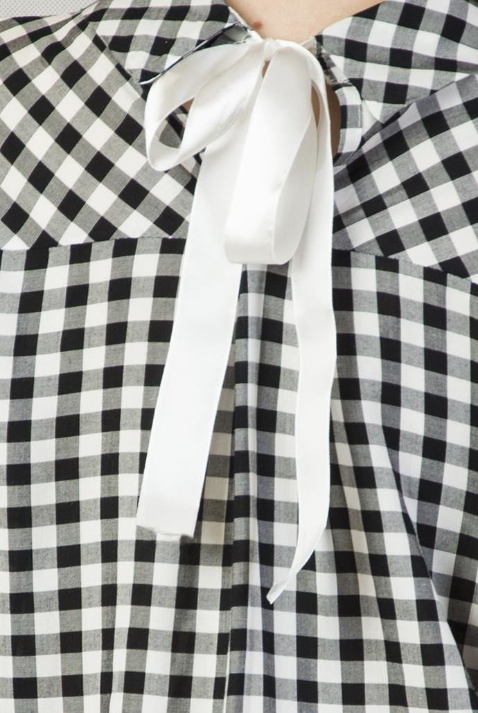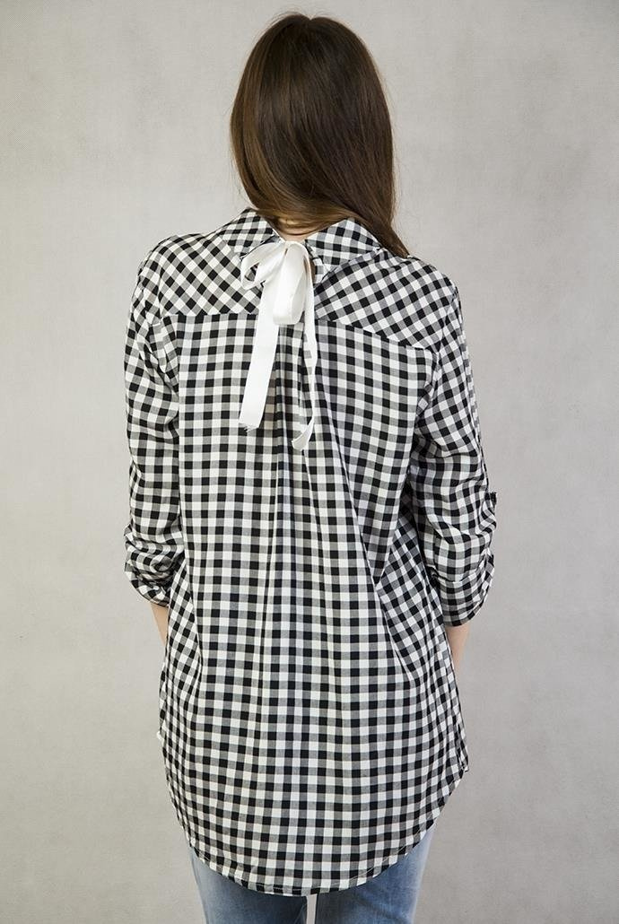 Asymetryczna Koszula w czarno-białą kratę z kieszonką z przodu oraz z tyłu wiązana na kokardkę.
