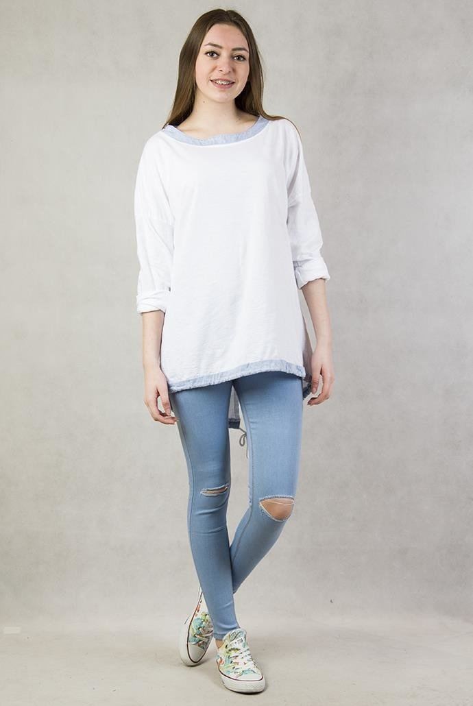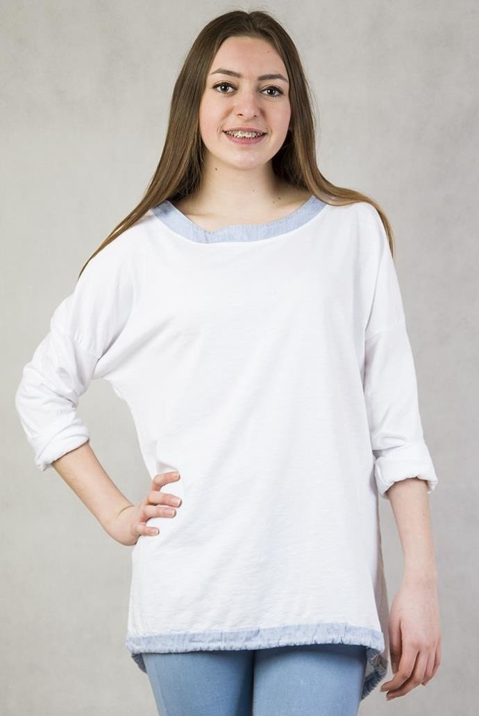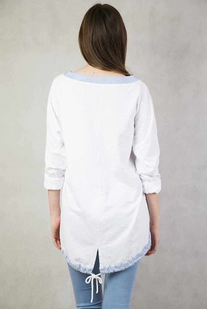 Asymetryczna biała bluzka ściągana oraz wiązana na dole z tyłu.