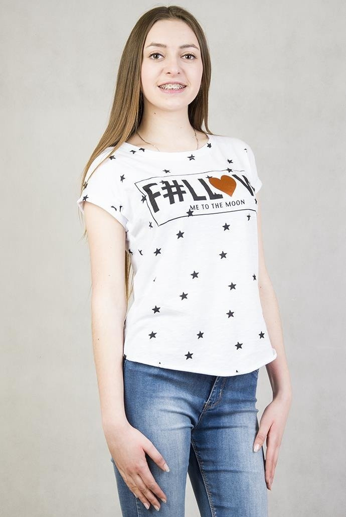 Biała bluzka w gwiazdki z napisem F#llow me to the moon