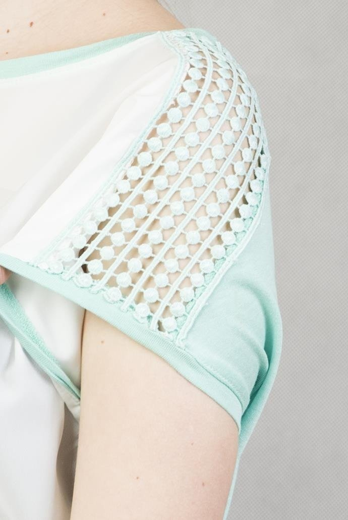 Zielona bluzka ze sztampą w piórka oraz koronkowymi wstawkami na ramionach.