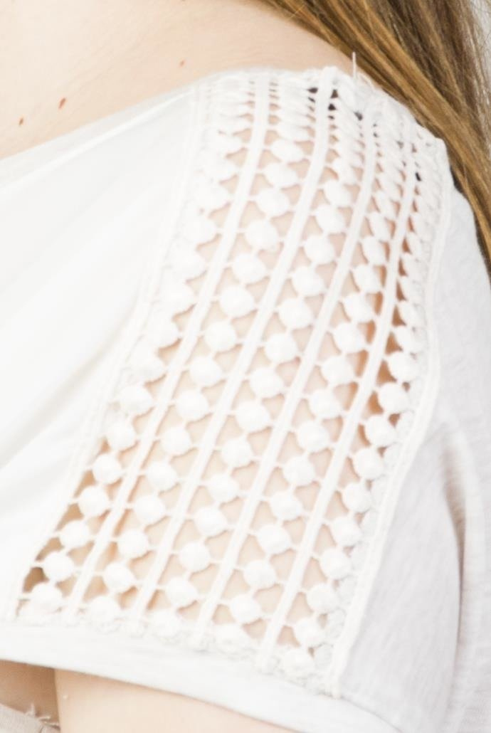 Beżowa bluzka ze sztampą w piórka oraz koronkowymi wstawkami na ramionach.