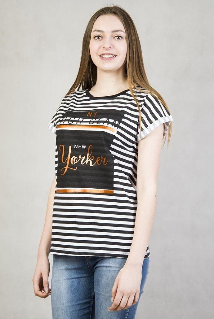 Biała bluzka w czarne paski z napisem : N1 HIGH GLAM NEW YORKER.