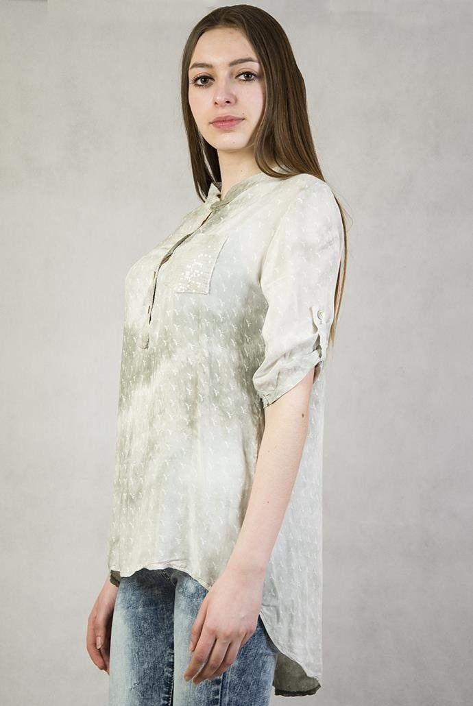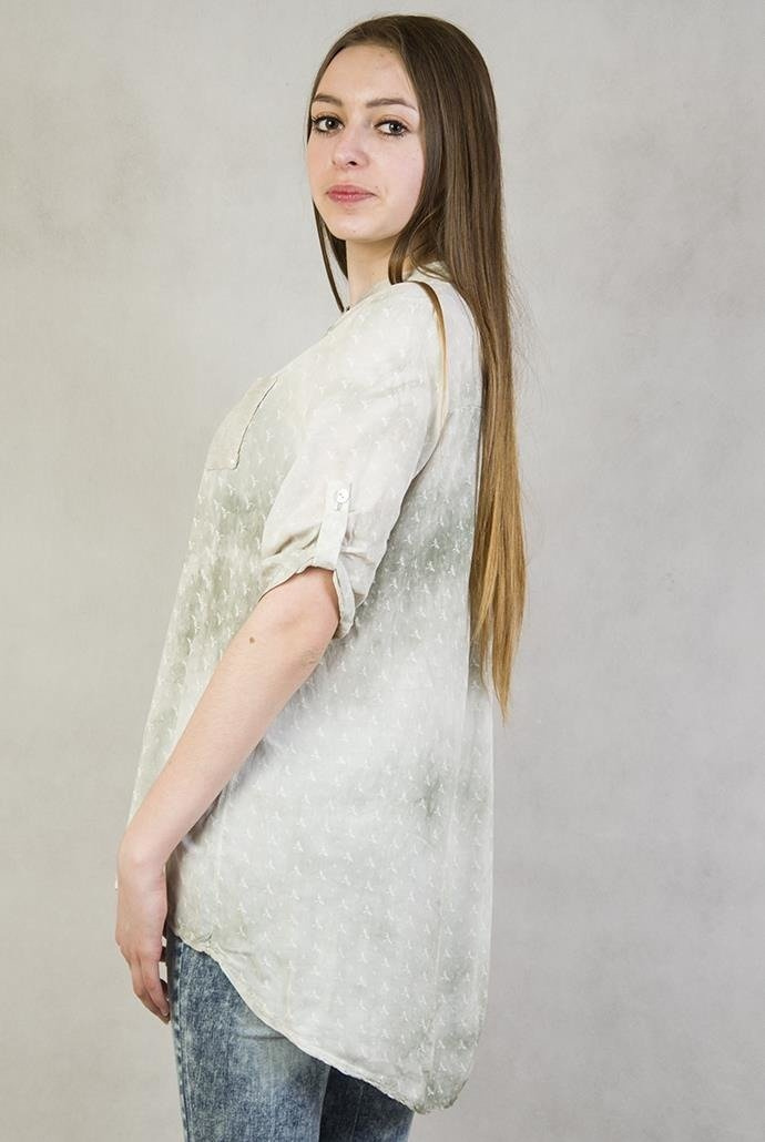 Zielona bluzka z przedłużanym tyłem i kieszonką.