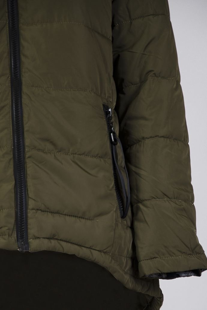 Pikowana, asymetryczna kurtka khaki. Kurtka ma odpinany kaptur.