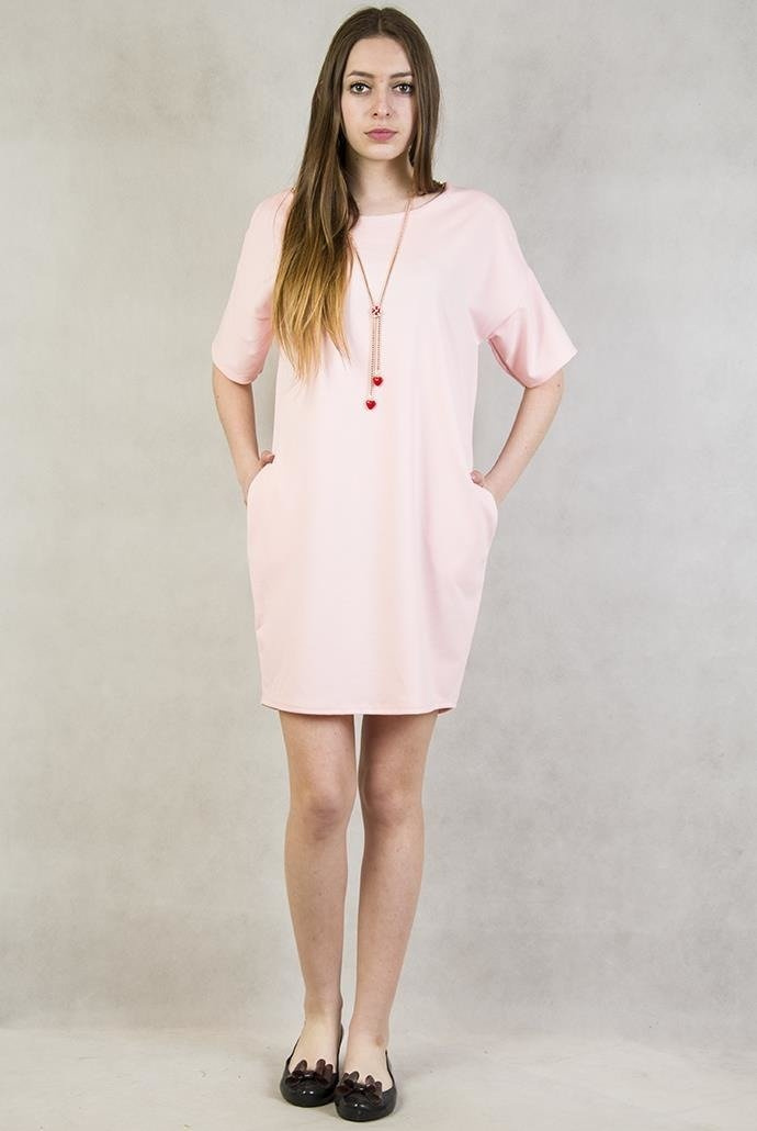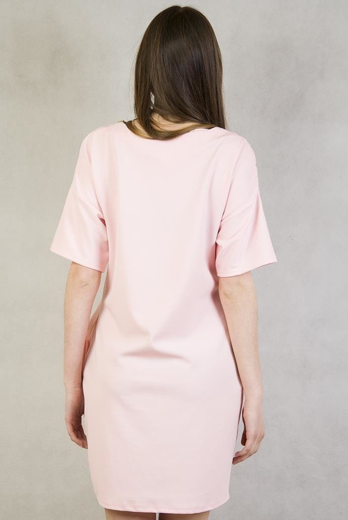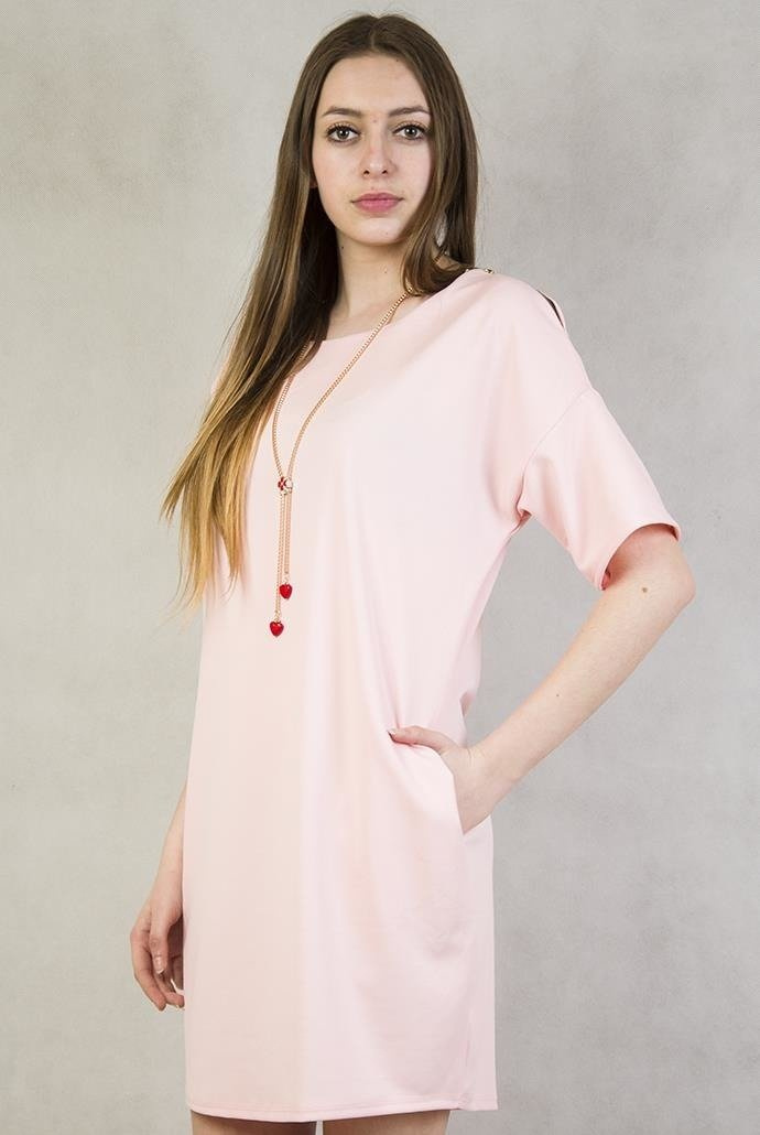 Sukienka różowa z zameczkami na ramionach i wisiorkiem w kolorze złota